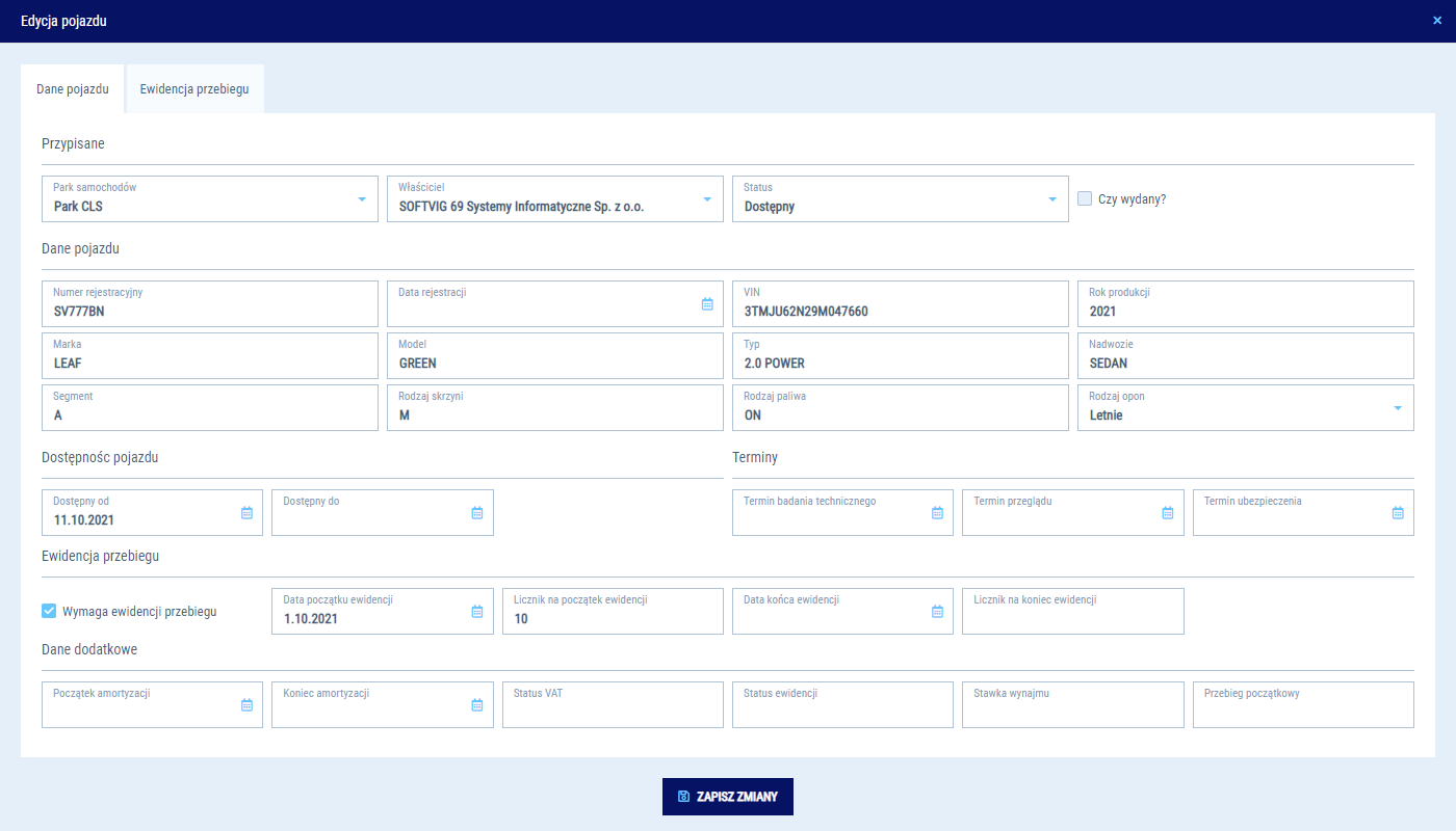 Aby dodać nowy pojazd wybierz operację Oprócz podstawowych informacji na temat pojazdu, możesz decydować zarówno o dostępności pojazdu, jaki i o tym czy ma mieć prowadzoną pełną ewidencję przebiegu. Wybrana konfiguracja będzie wpływać na konieczność podawania przebiegu podczas wydań i przyjęć przez osoby wynajmujące pojazd.