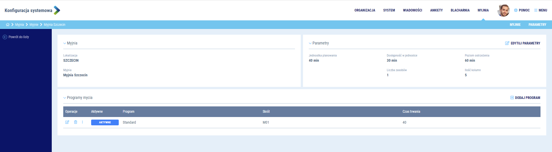 Myjnia jako współdzielony kalendarz dla wielu działów, wymaga odpowiedniej konfiguracji zdolności produkcyjnych. Dodatkowo, aby możliwe było planowanie zadań, niezbędne jest również uzupełnienie programów mycia. Jako Administrator wykonaj następującą konfigurację: