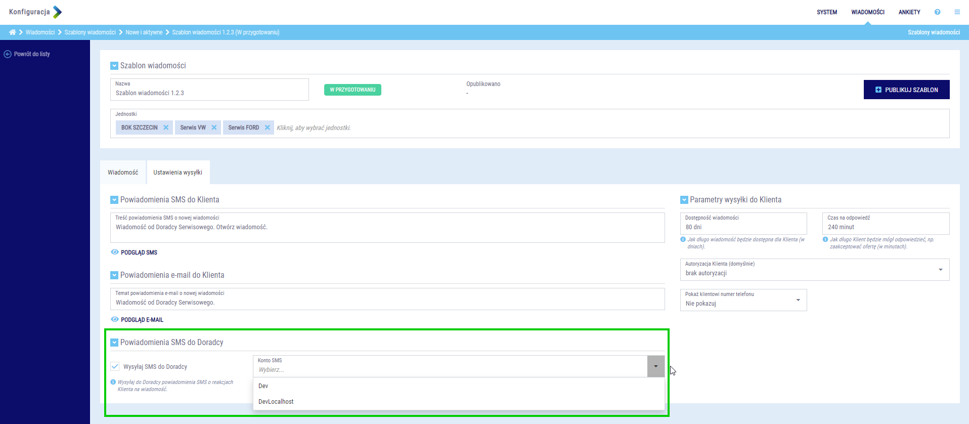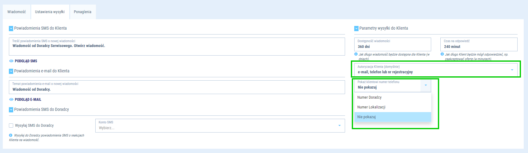 - Dostępność wiadomości - jak długo wiadomość będzie dostępna dla Klienta (w dniach)