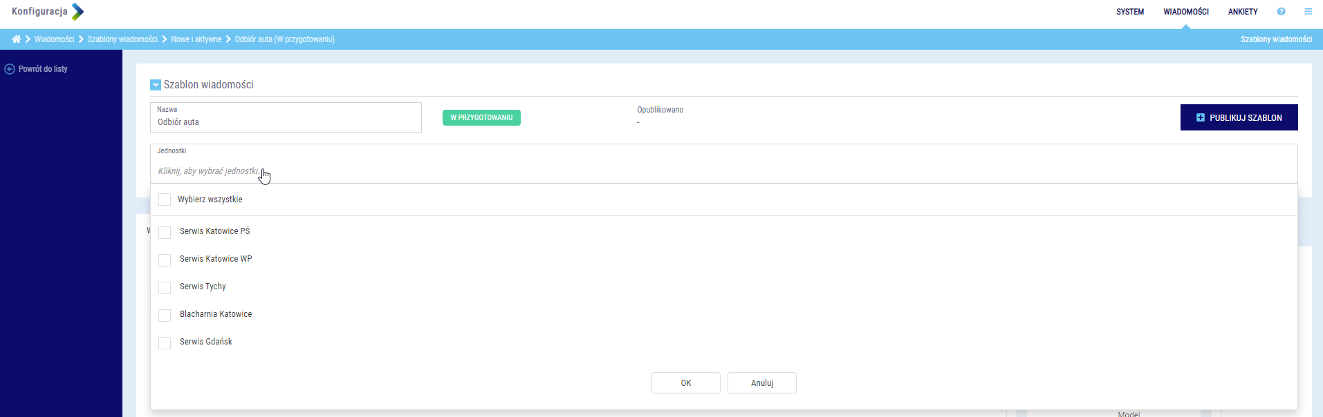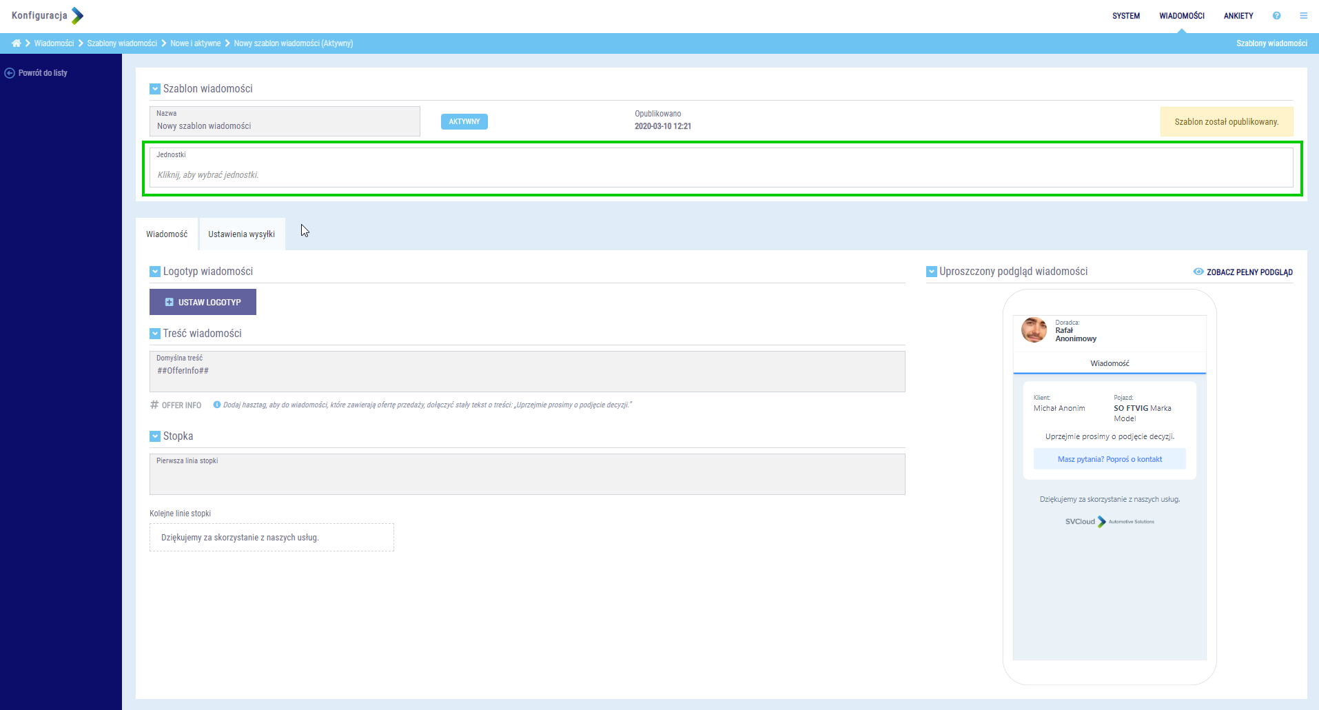 - Przypisywania szablonów wiadomości do odpowiednich jednostek w organizacji