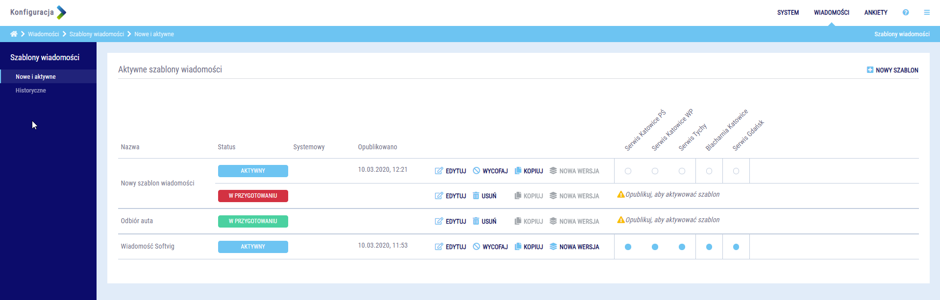 Lista Aktywnych szablonów wiadomości prezentuje zbiorczy widok dostępnych szablonów na których można wykonać szereg operacji. Składa się z następujących kolumn: