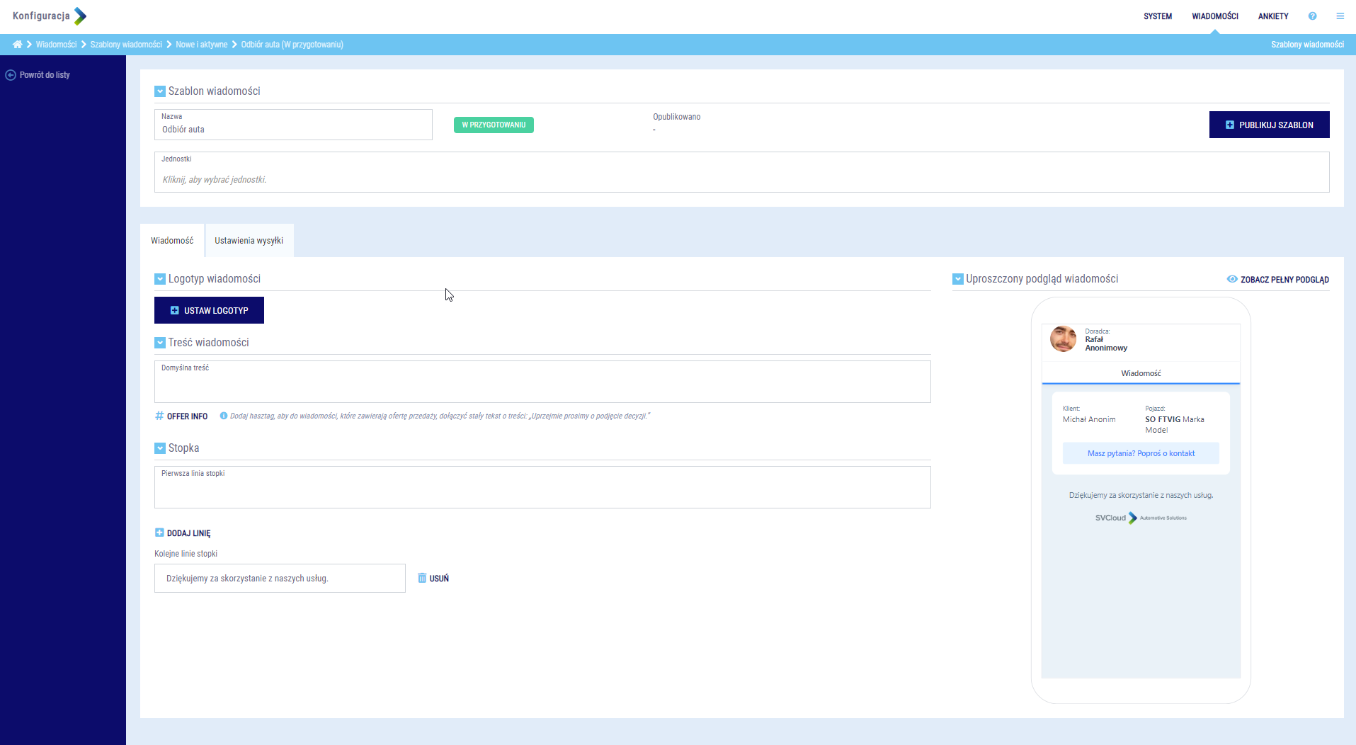 - Zakładka Wiadomość pozwala na skonfigurowanie następujących elementów szablonu: