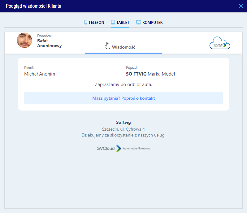 otwiera nowe okno w którym jest możliwość podglądu wiadomości na trzech typach urządzeń PC/Tablet/Telefon