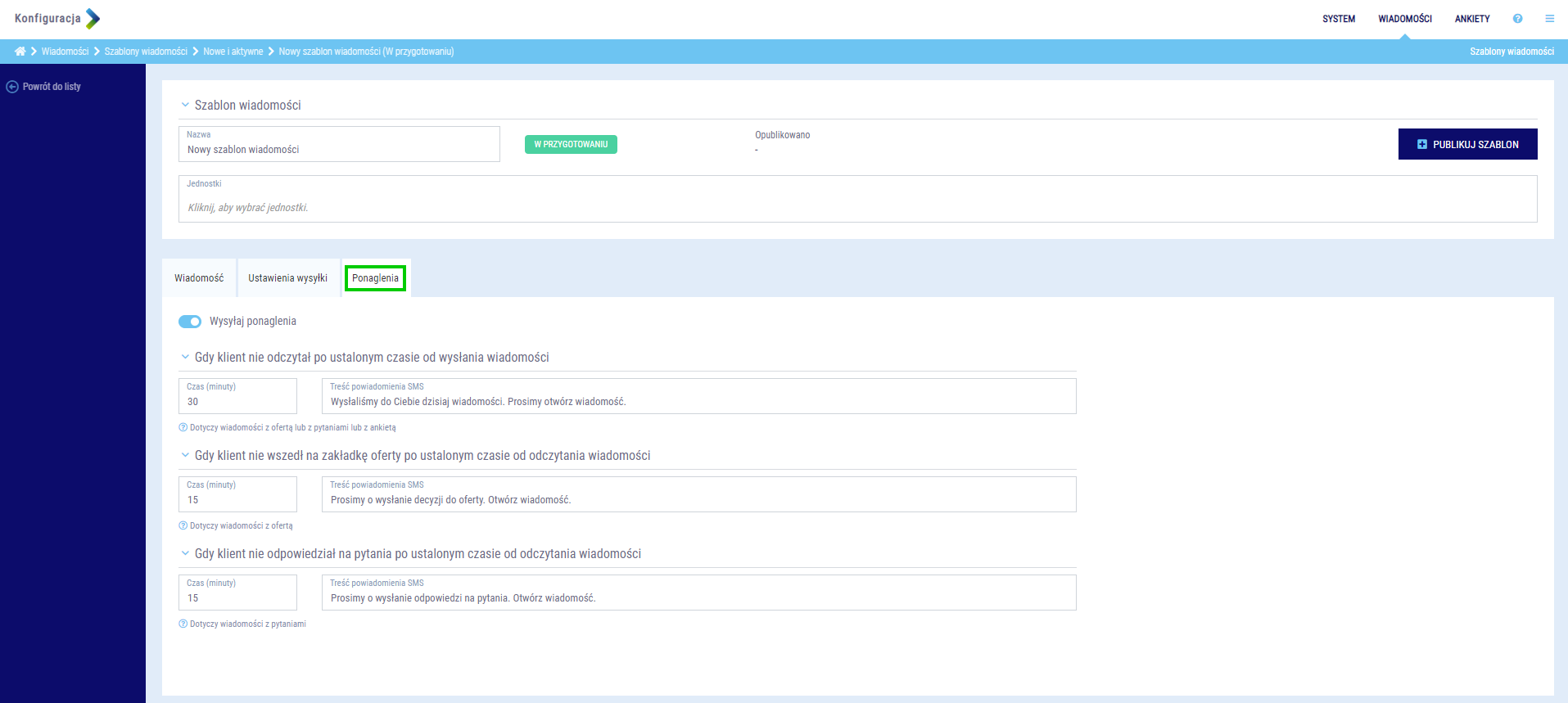 Dla każdego typu Użytkownik może zdefiniować treść wiadomości SMS oraz czas po jakim system ma wysłać ponaglenie.