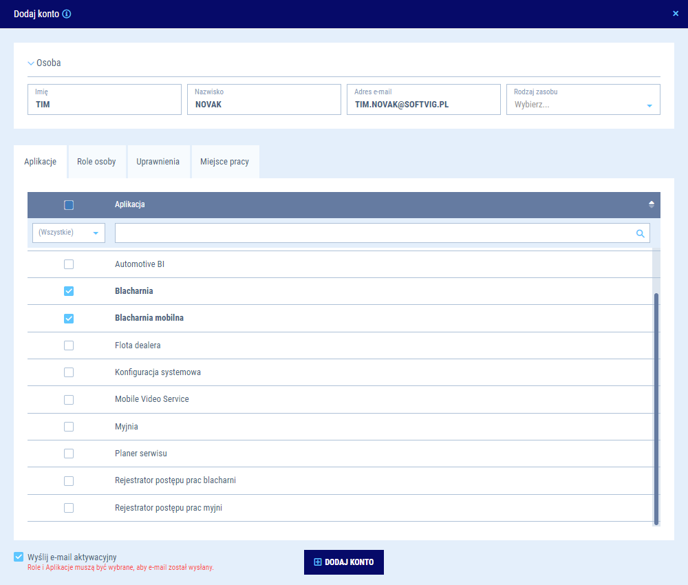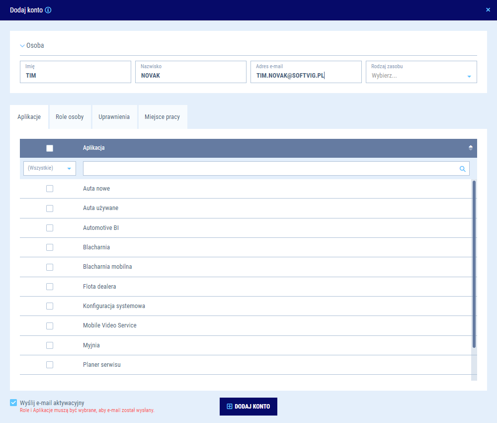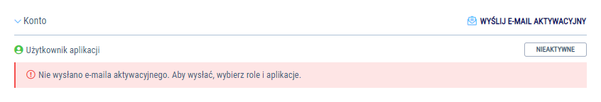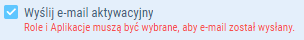 • Uwaga :!: Jeżeli konto konfigurowane jest wyłącznie jako zasób (brak potrzeby logowania się do platformy), to Administrator nie musi wysyłać e-maila aktywacyjnego.