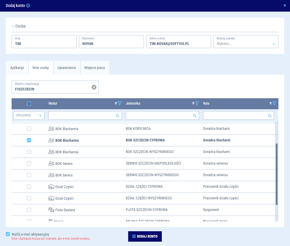W kolejnym kroku zdefiniuj role w zakładce . Role określają dostęp do konkretnych obszarów funkcjonalnych w usługach. W przypadku bardziej skomplikowanych organizacji i większej ilości zakupionych usług platformy możesz skorzystać z filtra lokalizacji oraz jednostek.
