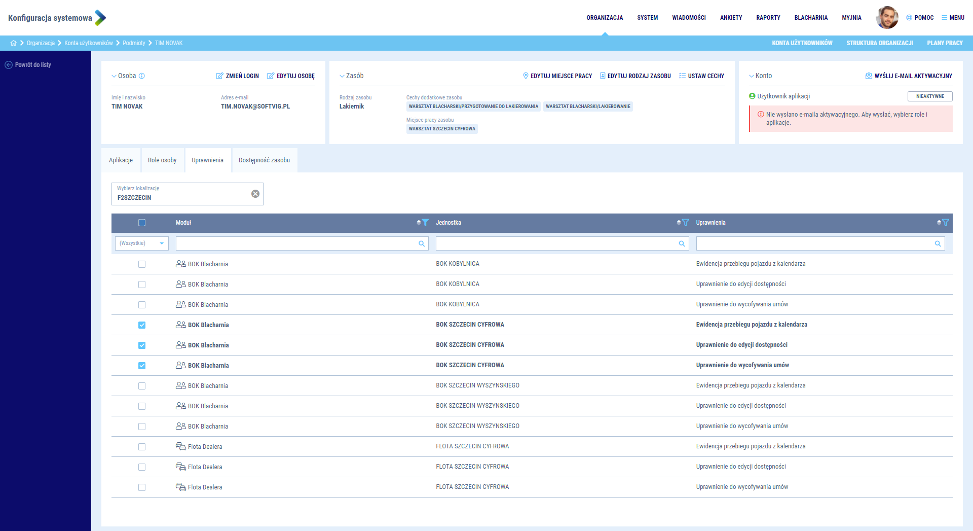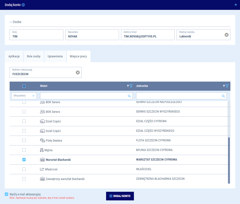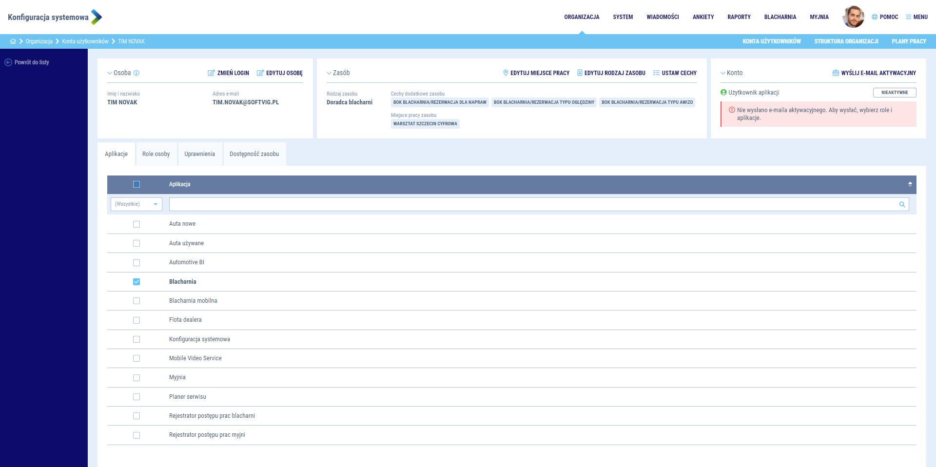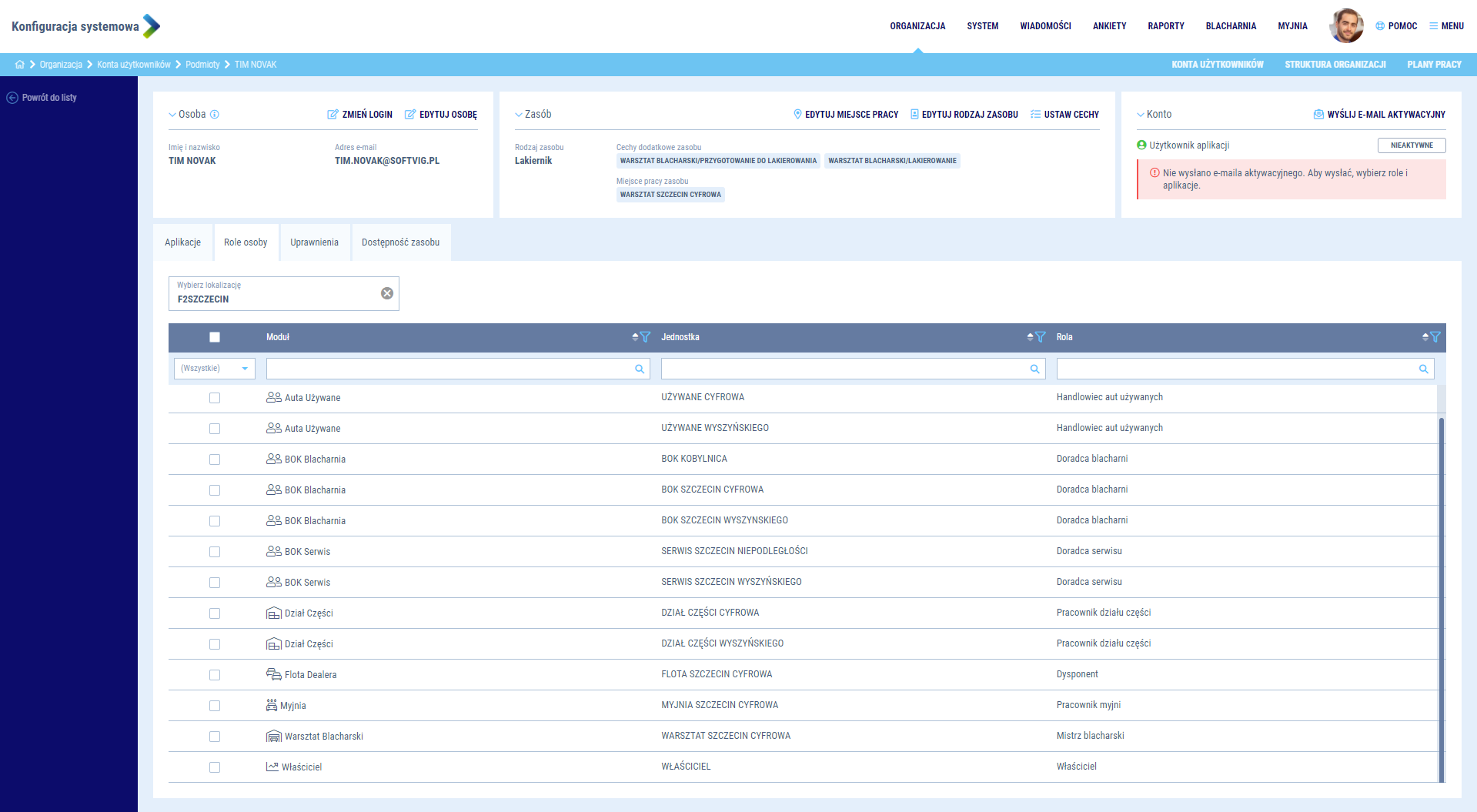 • Pracownik myjni - nadaj rolę umożliwiającą dostęp do dedykowanego działu myjni: