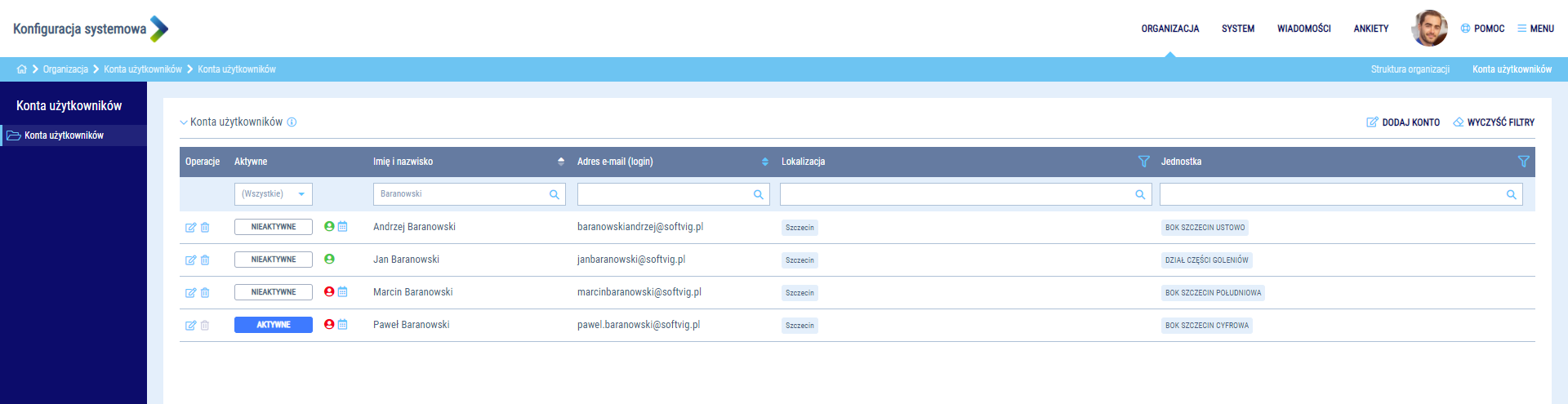 Jako administrator systemu, po wejściu do menu i otwarciu zakładki , zobaczysz listę wszystkich użytkowników platformy.