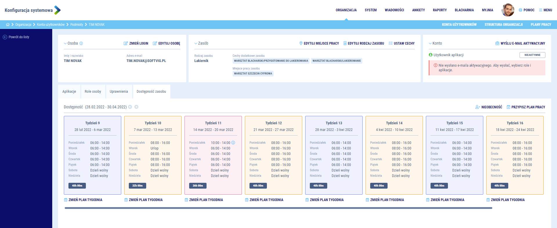 Konfiguracja zasobu pozwala Ci na umieszczanie danych konta użytkownika w słownikach usług. Dzięki temu możesz np. wyświetlić dany zasób w kalendarzach, czy też wprowadzać dane wymagające osoby odpowiedzialnej na konkretnym formularzu. Konfigurację zasobów również wykorzystasz w usługach, które wymagają planowania zadań na konkretne osoby np. Rejestrator postępu pracy blacharni czy też myjni.