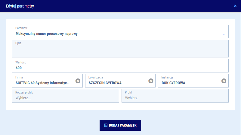 - Wartość definiująca liczbę dni wyświetlania teczek na panelach kontrolnych: „Naprawy z bliskim terminem wydania” oraz „Naprawy w warsztacie z bliskim terminem wydania”
