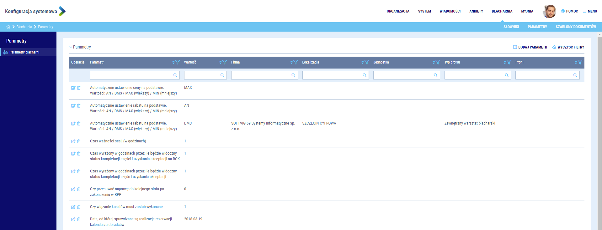 Jako Administrator masz możliwość zarządzania zdefiniowanymi parametrami usługi Blacharni. Każdy z parametrów posiada swoje domyślne wartości obowiązujące dla całej organizacji. Decyduj o tym, który dział ma korzystać z konfiguracji.
