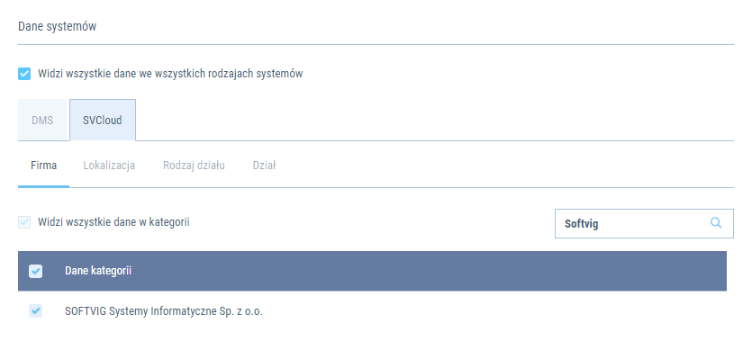 - Operacja „widzi wszystkie dane w kategorii” spowoduje, że w przyszłości - jeżeli pojawią się nowe dane w konkretnej zakładce systemu - nie będzie potrzebna rekonfiguracja użytkownika. Użytkownik automatycznie otrzyma uprawnienia do danych w kategorii.