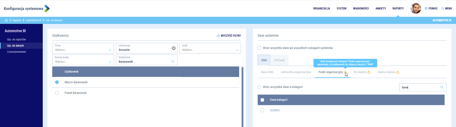 Jako Administrator aplikacji decydujesz również o tym, z jakich danych mogą korzystać użytkownicy platformy. Konfiguracja odbywa się na poziome przypisania uprawnień pomiędzy użytkownikiem a systemem, z którego pochodzą dane. Pamiętaj o uzupełnieniu wszystkich zakładek w konfiguracji uprawnień do danych. Tylko pełny pakiet informacji o tym, które dane z systemu mają być dostępne dla użytkownika, pozwoli na poprawne wyświetlenie raportów BI. System przypomni Ci o nieuzupełnionych danych wyświetlając ostrzeżenie w postaci ikony