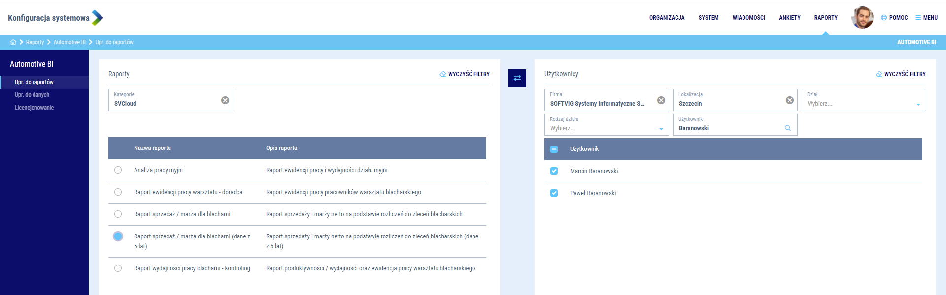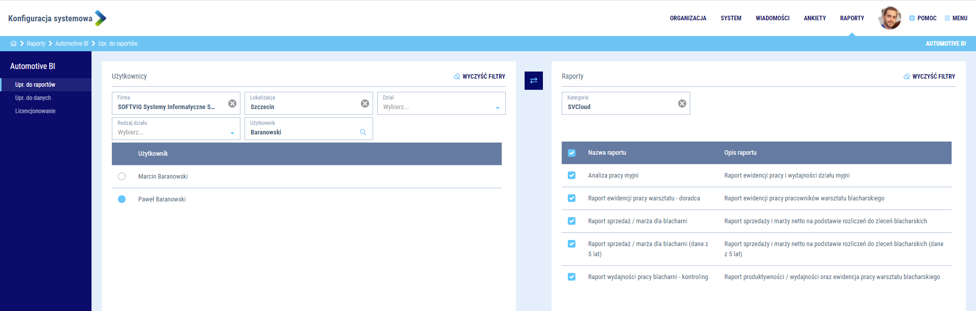 Jako Administrator aplikacji decydujesz o tym, z jakich raportów BI mogą korzystać użytkownicy platformy. Konfiguracja odbywa się na poziome przypisania uprawnień pomiędzy użytkownikiem, a raportem BI. W każdym momencie możesz zawężać dane przypisywane za pomocą filtrów, a także zmieniać kontekst przypisania uprawnień raportów BI. Wystarczy kliknąć w ikonę