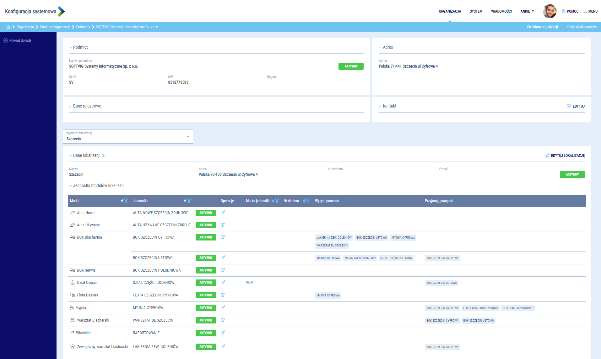 Szczegółowy podgląd struktury organizacji prezentuje kompletną mapę powiązań pomiędzy działami, umożliwia weryfikację danych wprowadzonych na etapie wdrożenia, a także korektę danych adresowych i kontaktowych.