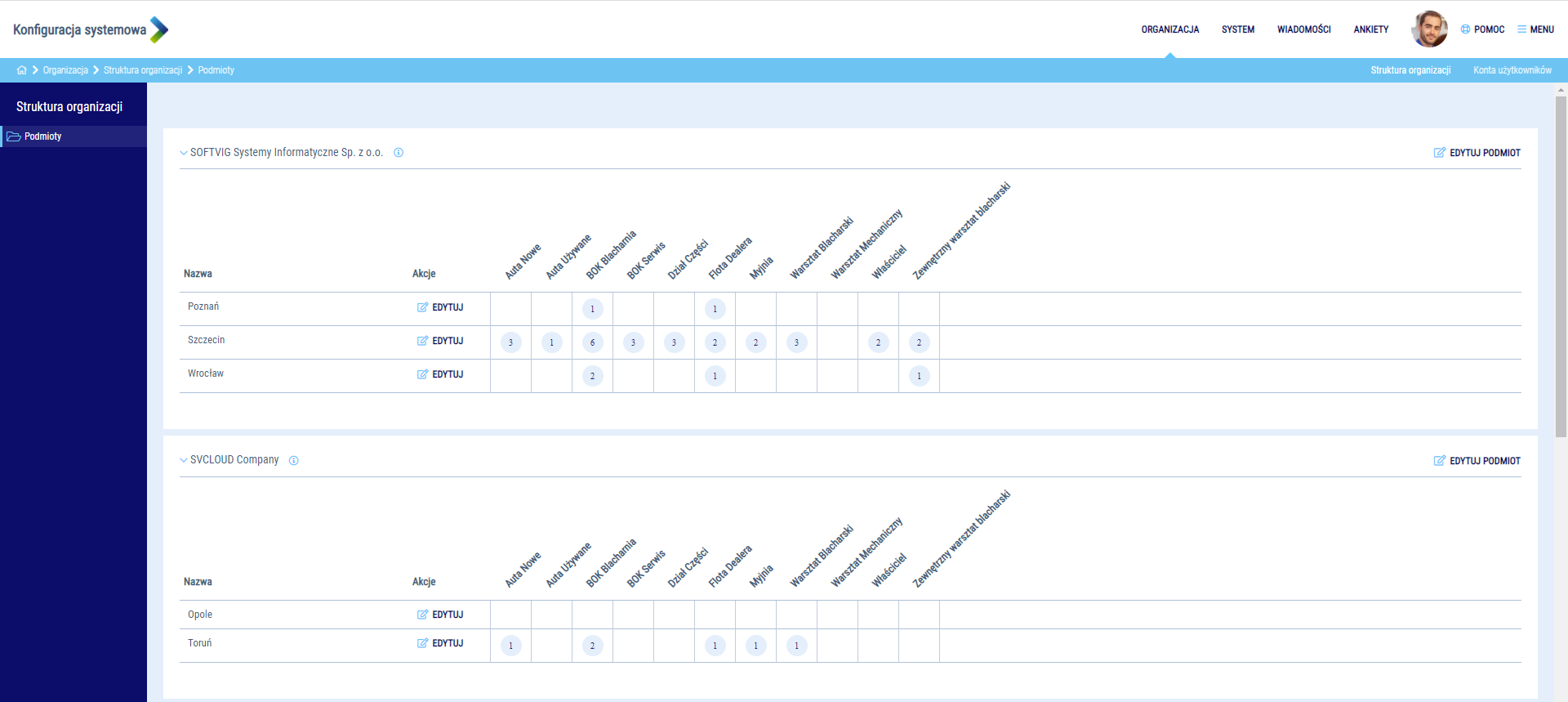 Struktura organizacji umożliwia administratorowi wgląd w dane dotyczące konfiguracji wykonanej przez SuperAdmina na etapie wdrożenia produktów. Widok powinien odzwierciedlać rzeczywistą strukturę organizacji, z oznaczeniem zakupionych usług