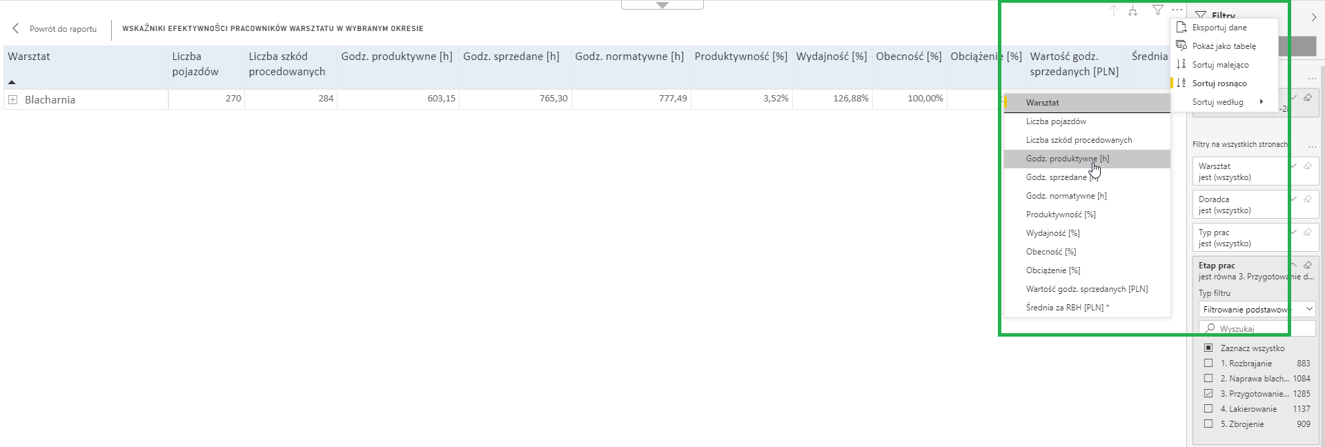 Zawężaj dane i odczytuj ważne dla Ciebie informacje. Użyj filtra 'Etap prac' i wybierz prace lakiernicze. Filtrowanie powoduje zawężanie danych widocznych w raporcie.