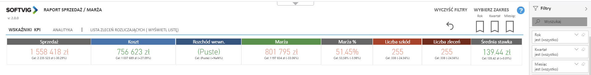 Wskaźniki KPI w raporcie sprzedaż/marża dla blacharni