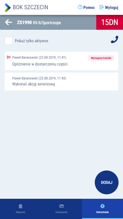– aktywne ostrzeżenie na teczce naprawy