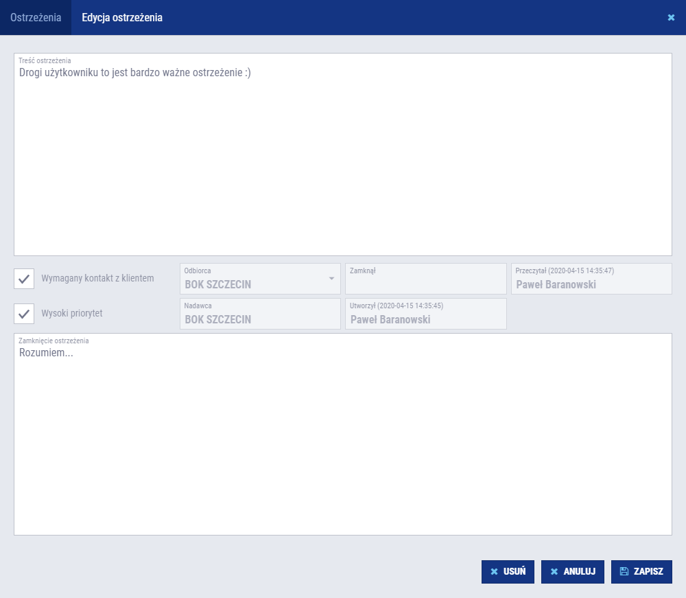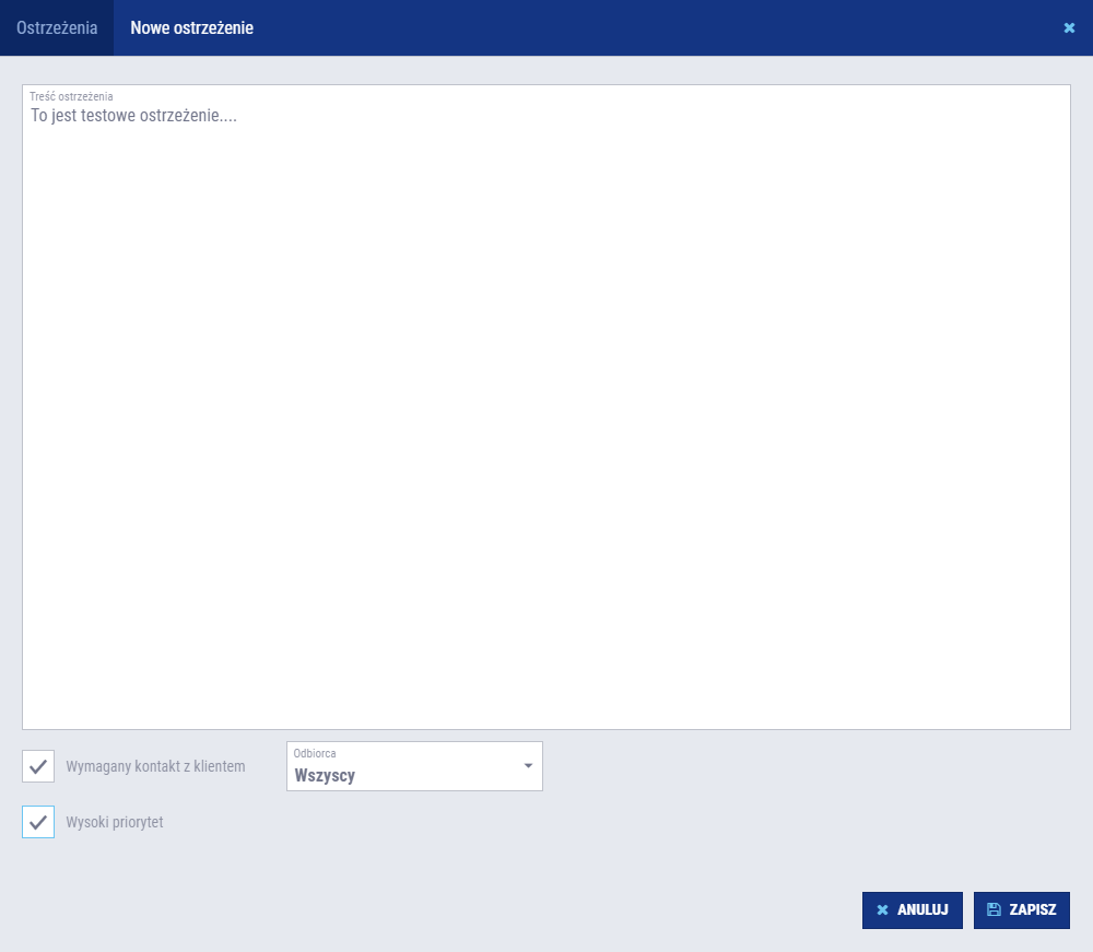 Uzupełnij treść ostrzeżenia i zapisz formularz.