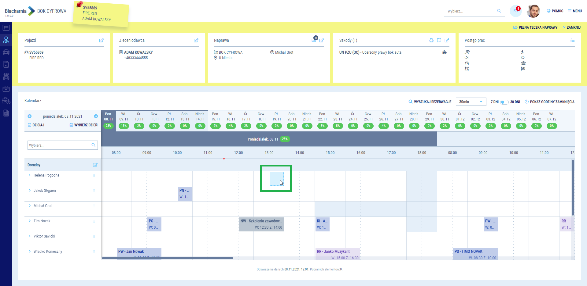 Status teczki naprawy na konkretnym etapie będzie odzwierciedlał stan rezerwacji w kalendarzu doradców.