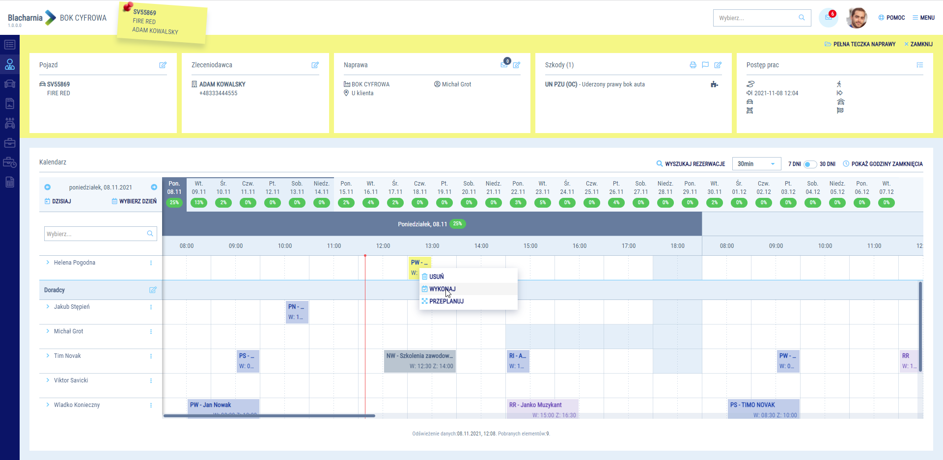 Poniżej zostały przedstawione sekcje tablicy zarządzania szkodami oraz współpracujące z nim rezerwacje z kalendarza doradców: