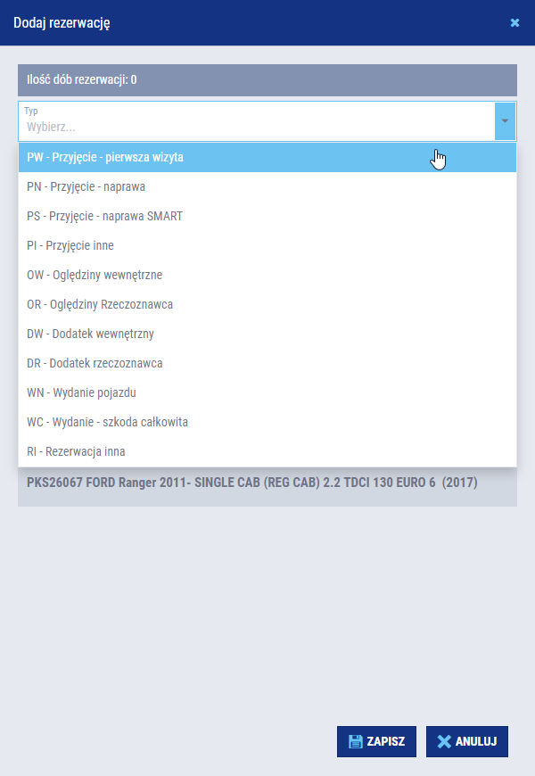 Dla kalendarza doradców (pierwsza wizyta, oględziny, przyjęcie i wydanie pojazdu), oznaczenia informują odpowiednio: