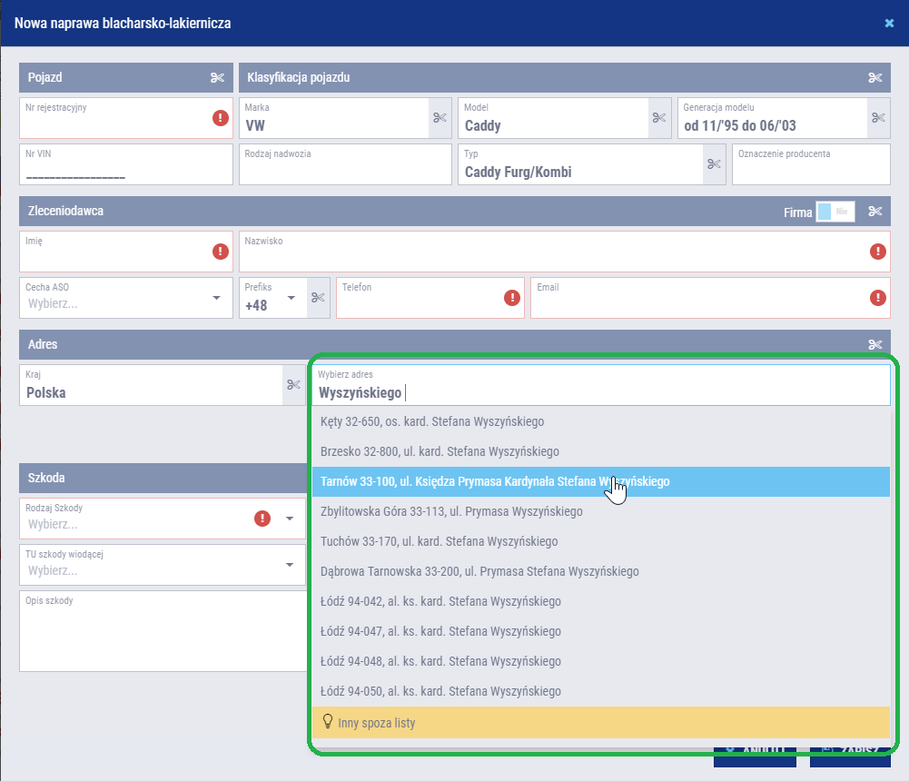 Rozpocznij wpisywanie danych w polu obsługującym słownik, a dane zaczną się podpowiadać automatycznie.