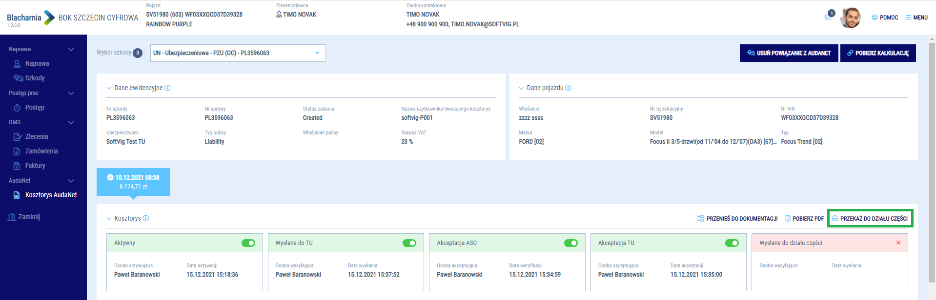 Aby przekazać sprawę do działu części, wejdź do pełnej teczki naprawy. Następnie przejdź do sekcji kosztorysu AudaNet. Pamiętaj, że wysyłka sprawy do działu części odbywa się w kontekście szkody, której likwidacja następuje w oparciu o kosztorys ściśle współpracujący z działem części. Kliknij aby przekazać zamówienia do działu części i poczekaj, aż pracownik działu na podstawie kosztorysu zamówi części, które są wymagane do realizacji naprawy.