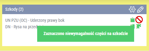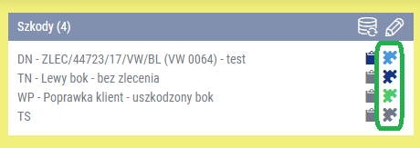 – dla teczki naprawy wszystkie szkody mają zrealizowane zamówienia na części (wydane bądź skompletowane), a od operacji nie upłynęły 3 dni. - Brak ikony puzzla - dla teczki naprawy wszystkie szkody mają zrealizowane zamówienia na części (wydane bądź skompletowane), a od operacji upłynęły 3 dni