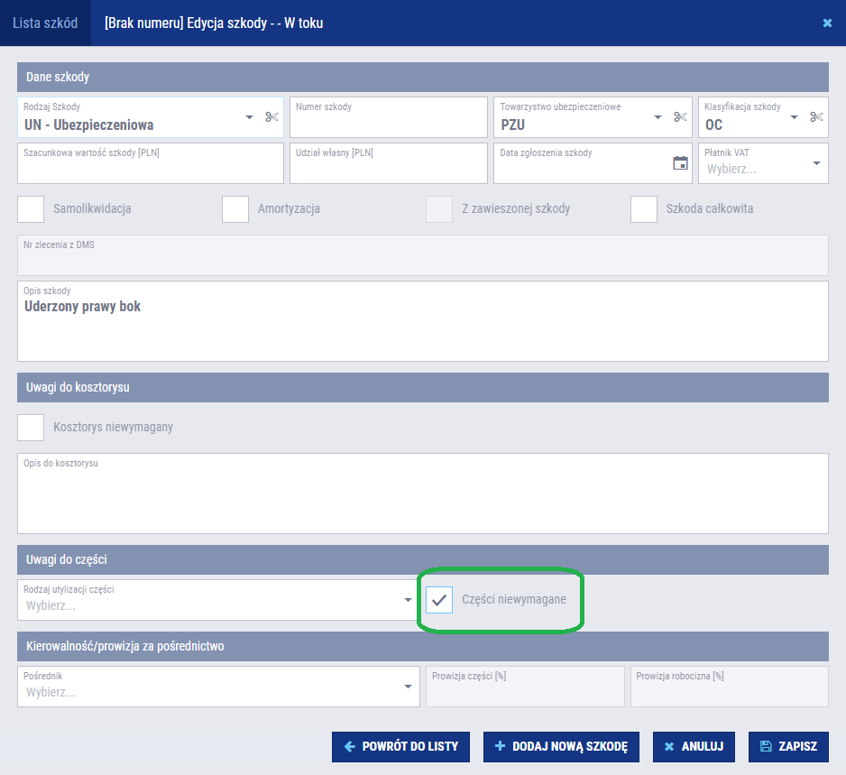 Jeżeli nie potrzebujesz części do naprawy możesz od razu podnieść teczkę do kontekstu i przejść do edycji szkody za pomocą