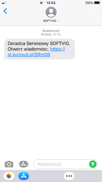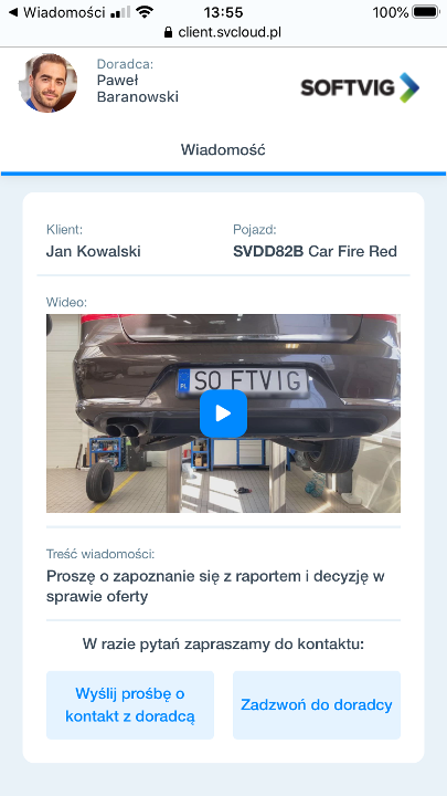 Wysłana przez Ciebie e-wiadomość może dotrzeć do klienta poprzez SMS lub email. W wiadomości klient znajdzie link, który przekieruje go na stronę gdzie będzie miał możliwość odczytania wiadomości i obejrzenia materiałów multimedialnych (wideo i zdjęcia).