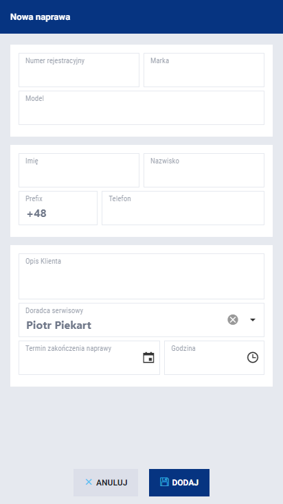 Zobaczysz ekran dodawania nowej naprawy, który pozwoli Ci na uzupełnienie wskazanego zestawu danych. Jedynym wymaganym polem formularza będzie 'Numer rejestracyjny', a uzupełnienie numeru telefonu lub adresu email osoby kontaktowej pozwoli - w kolejnym etapie - na wysłanie e-wiadomości do klienta. Warto również wprowadzić 'Termin zakończenia naprawy', ponieważ umożliwi to kontrolowanie przebiegu naprawy.