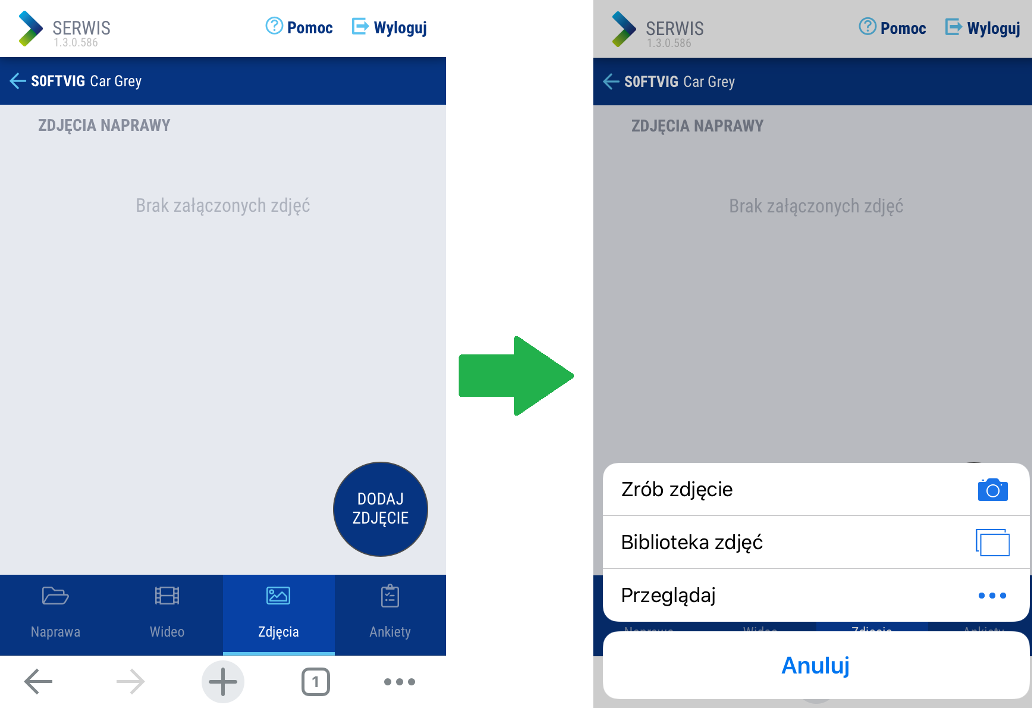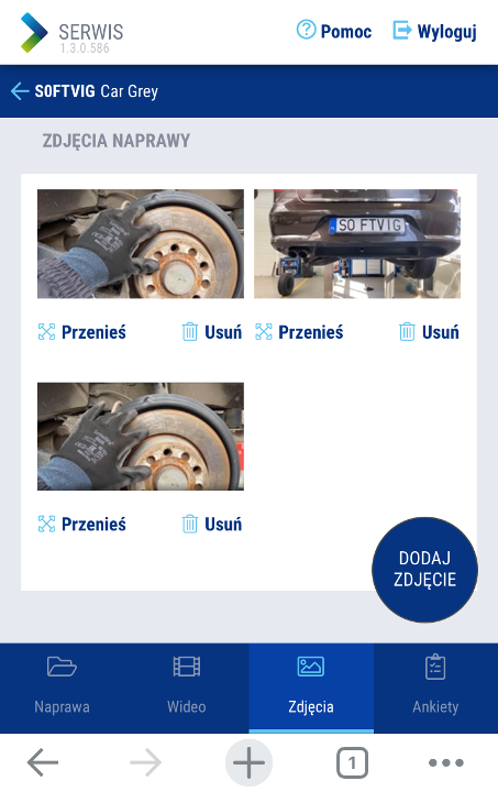 Po wejściu w szczegółowy widok naprawy wybierz zakładkę 'Zdjęcia' z dolnego menu i użyj przycisku .