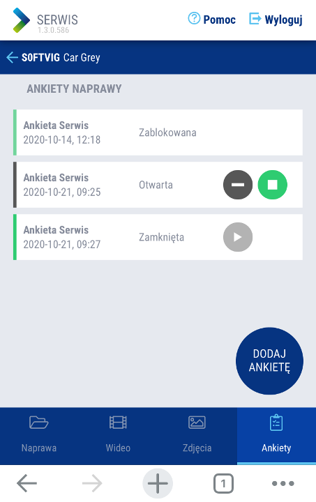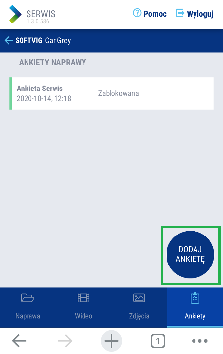 Ankieta jest listą pytań i czynności wykonywanych w określonym celu. Jeżeli chcesz wypełnić ankietę w aplikacji mobilnej Mobile Video Service wyszukaj pojazd po numerze rejestracyjnym. Gdy go odnajdziesz i przejdziesz do szczegółowego widoku naprawy, wybierz zakładkę 'Ankiety' z dolnego menu i użyj przycisku