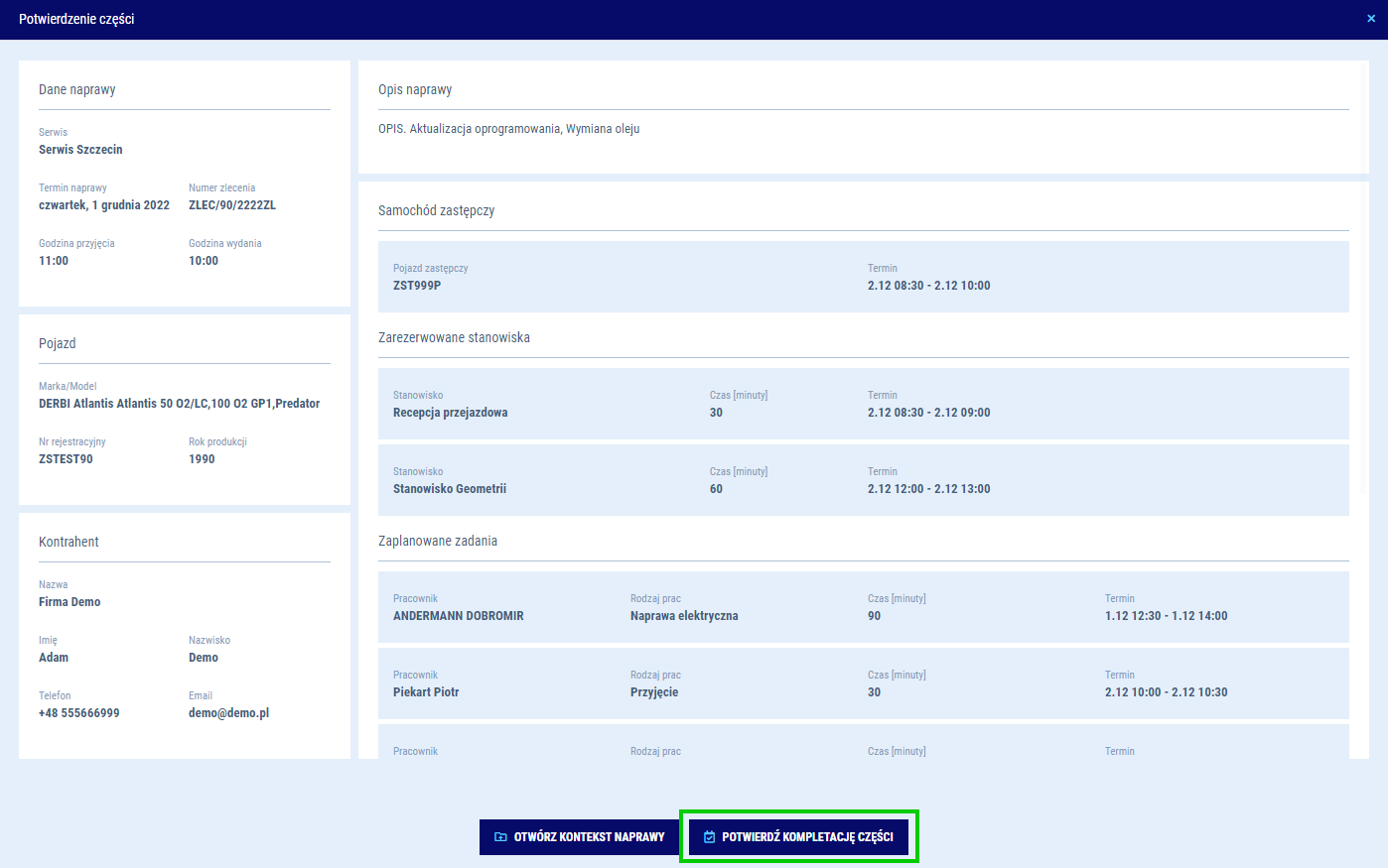 Potwierdzenie kompletacji części poprzez kontekst naprawy