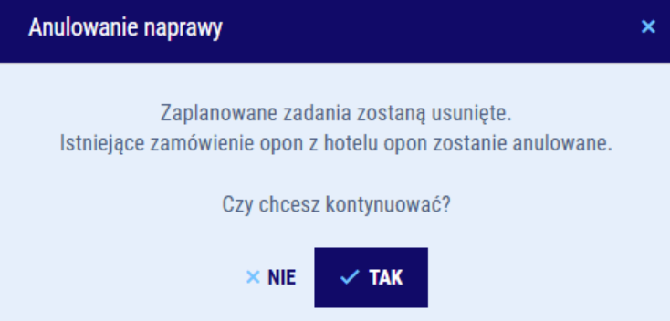 • Gdy użyjesz operacji 'Zmień status naprawy' i wybierzesz opcję 'Anulowana', wyświetli się komunikat z opcją potwierdzenia decyzji o tym, że naprawa, oraz zamówienie na opony w hotelu opon zostaną anulowane.