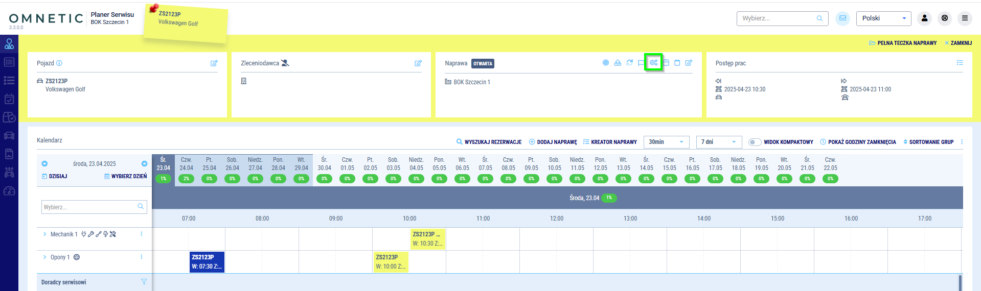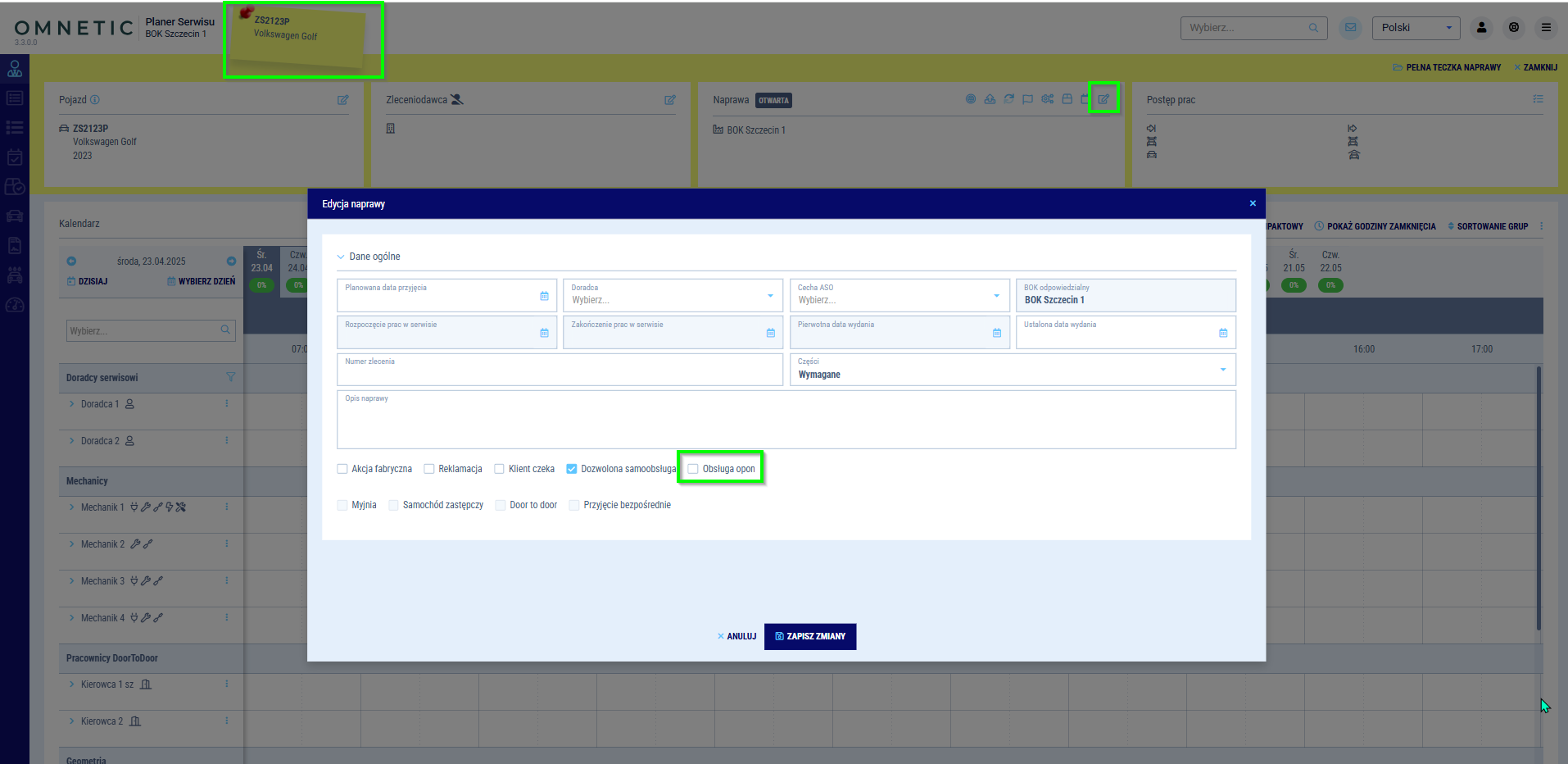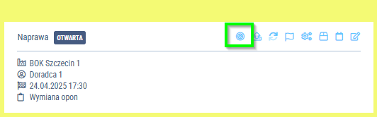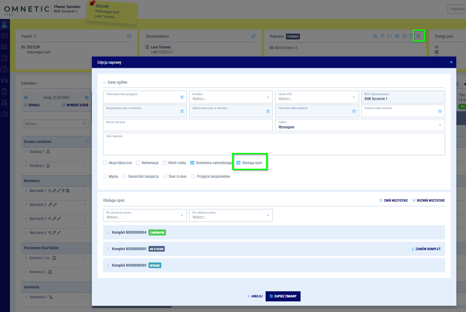 • Z poziomu kontekstu naprawy wybierz ikonę edycji i zaznacz okienko 'Obsługa opon'