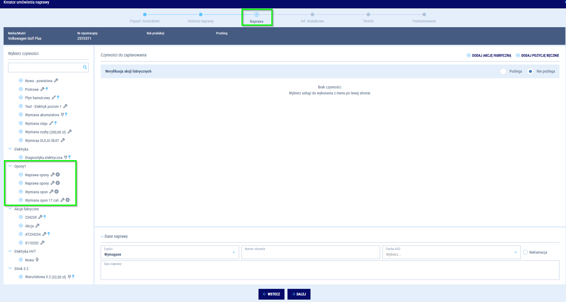 Planując naprawę możemy określić, że będzie zawierać prace związane z obsługą opon. Można to zrobić poprzez wybór czynności serwisowej dedykowanej obsłudze opon. Czynności serwisowe mogą być skonfigurowane przez Lokalnego administratora.