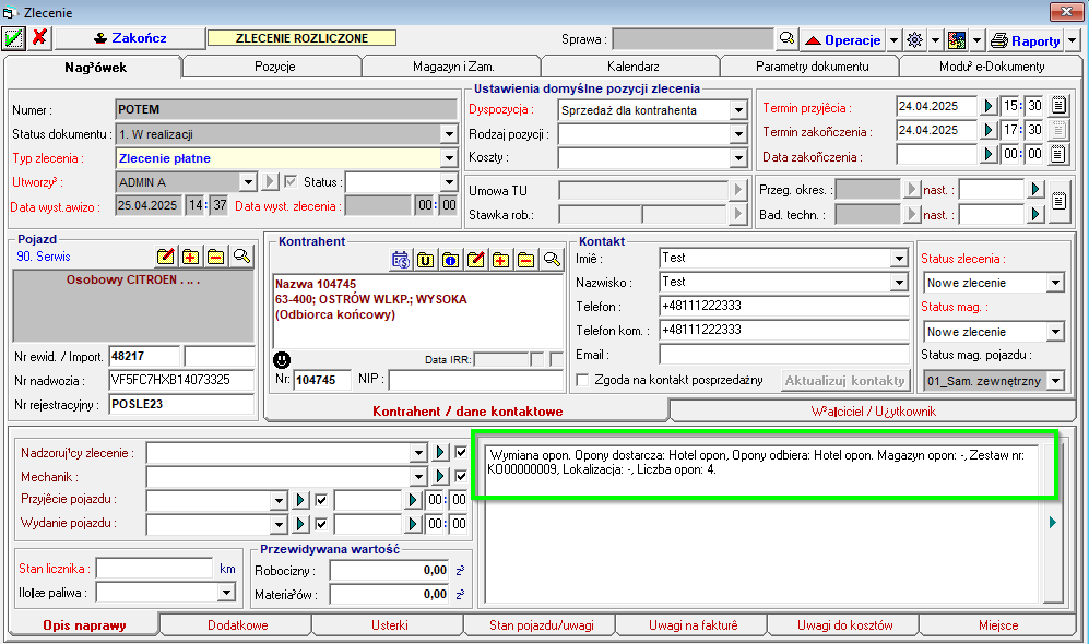 Wysłanie do DMS Autostacja 3 naprawy zawierającej zamówienie na komplet opon (powiązanie naprawy Planera ze zleceniem), przekaże w opisie naprawy informacje o zamówionych oponach i lokalizacji ich przechowywania. Dane o zamówieniu opon nie są już później synchronizowane.