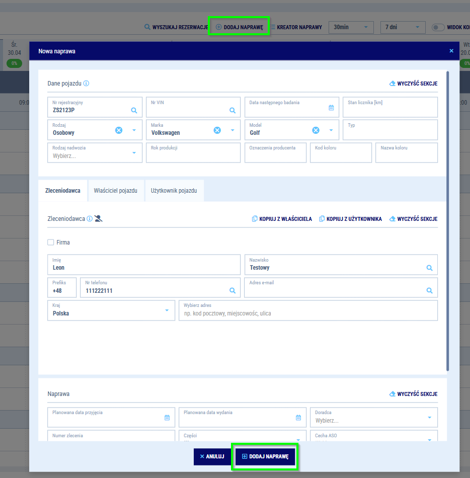 • Użyj operacji ‘Dodaj naprawę’ uzupełnij dane i zapisz naprawę