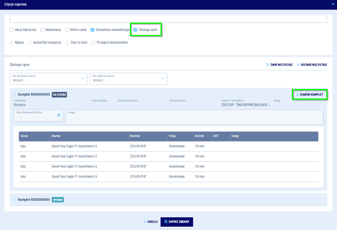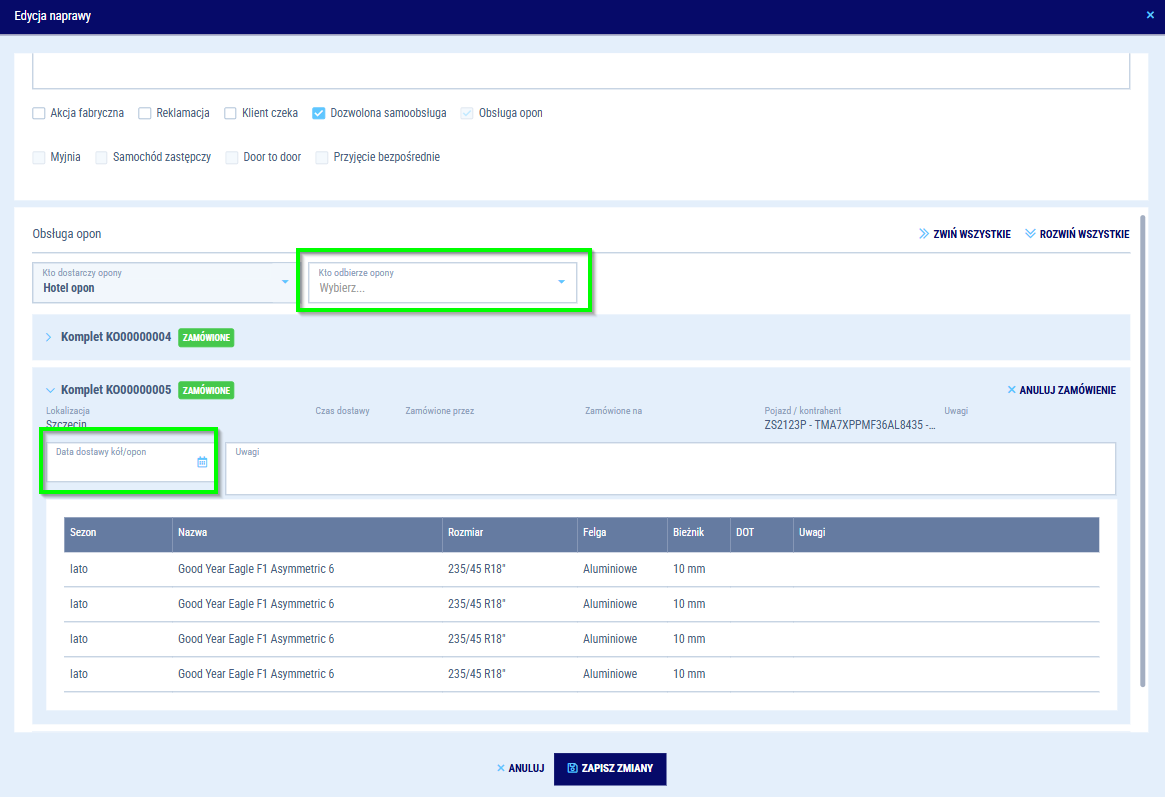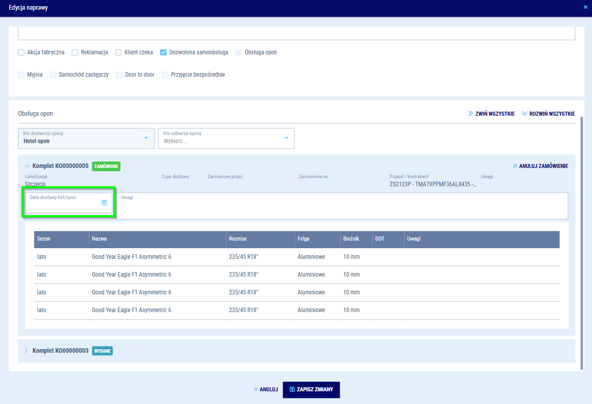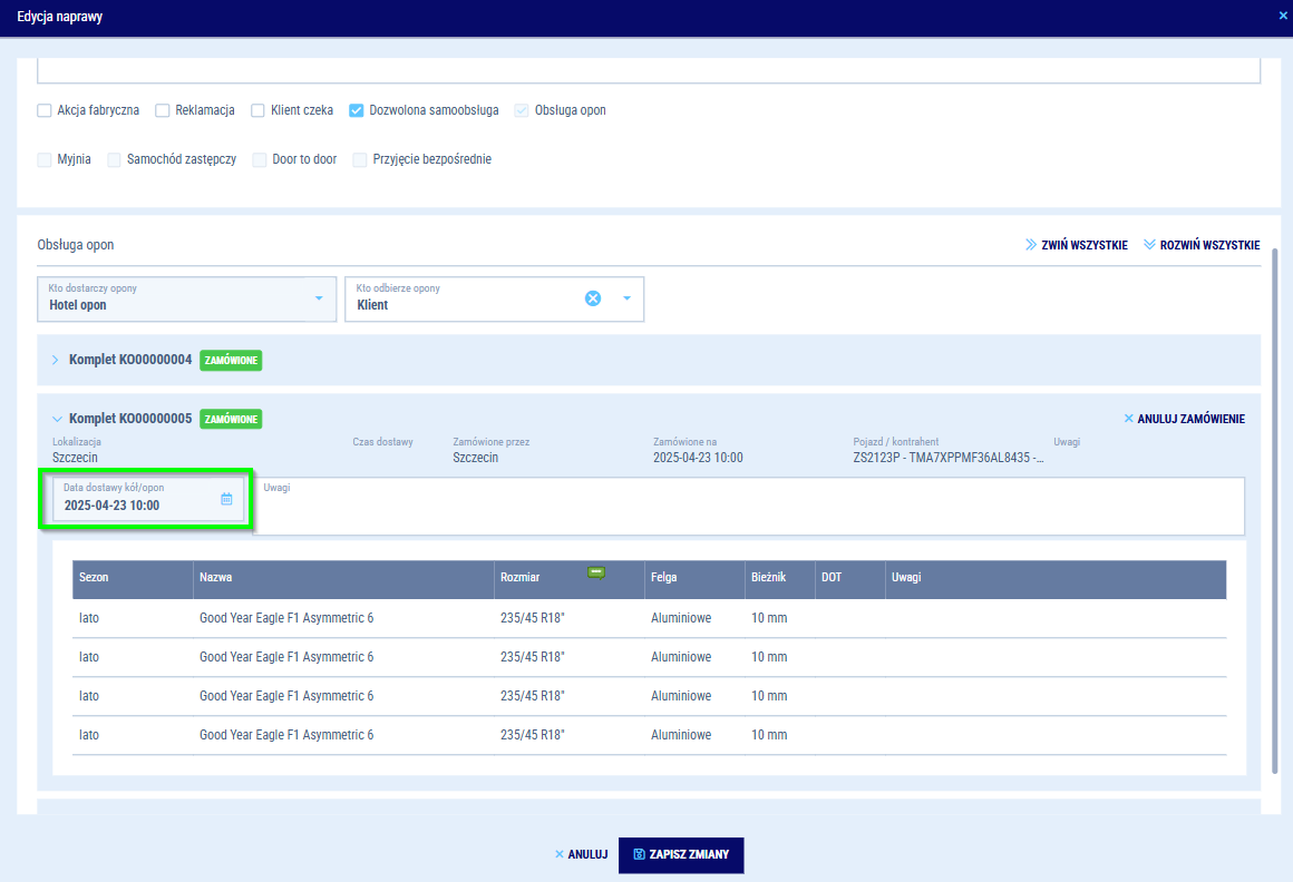 Edycja naprawy - data dostarczenia opon zgodna z początkiem zaplanowanych prac na warsztacie