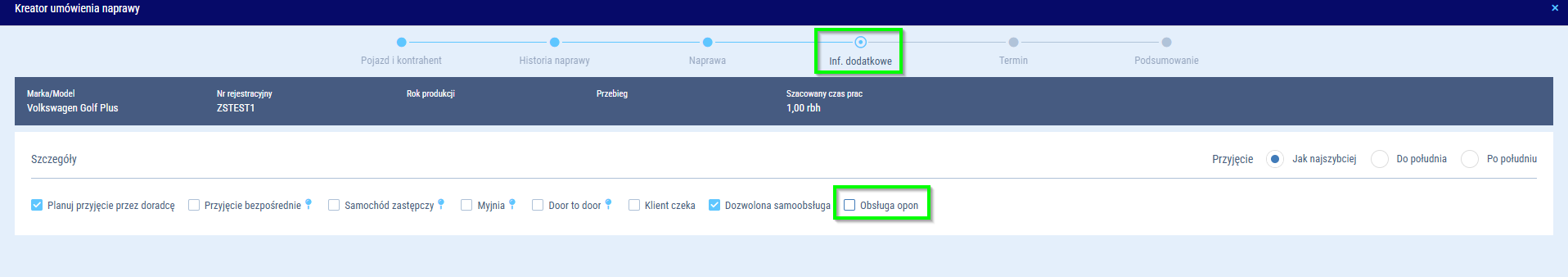 Jeżeli nie masz dedykowanych czynności serwisowych podwiązanych z wymianą opon, to możesz dodać zamówienie na opony do naprawy z kroku 'Informacje dodatkowe' kreatora, poprzez zaznaczenie okienka 'Obsługa opon'.