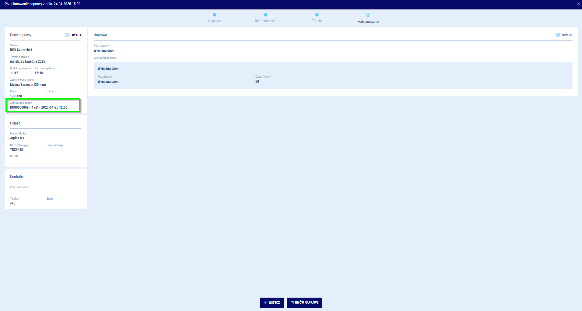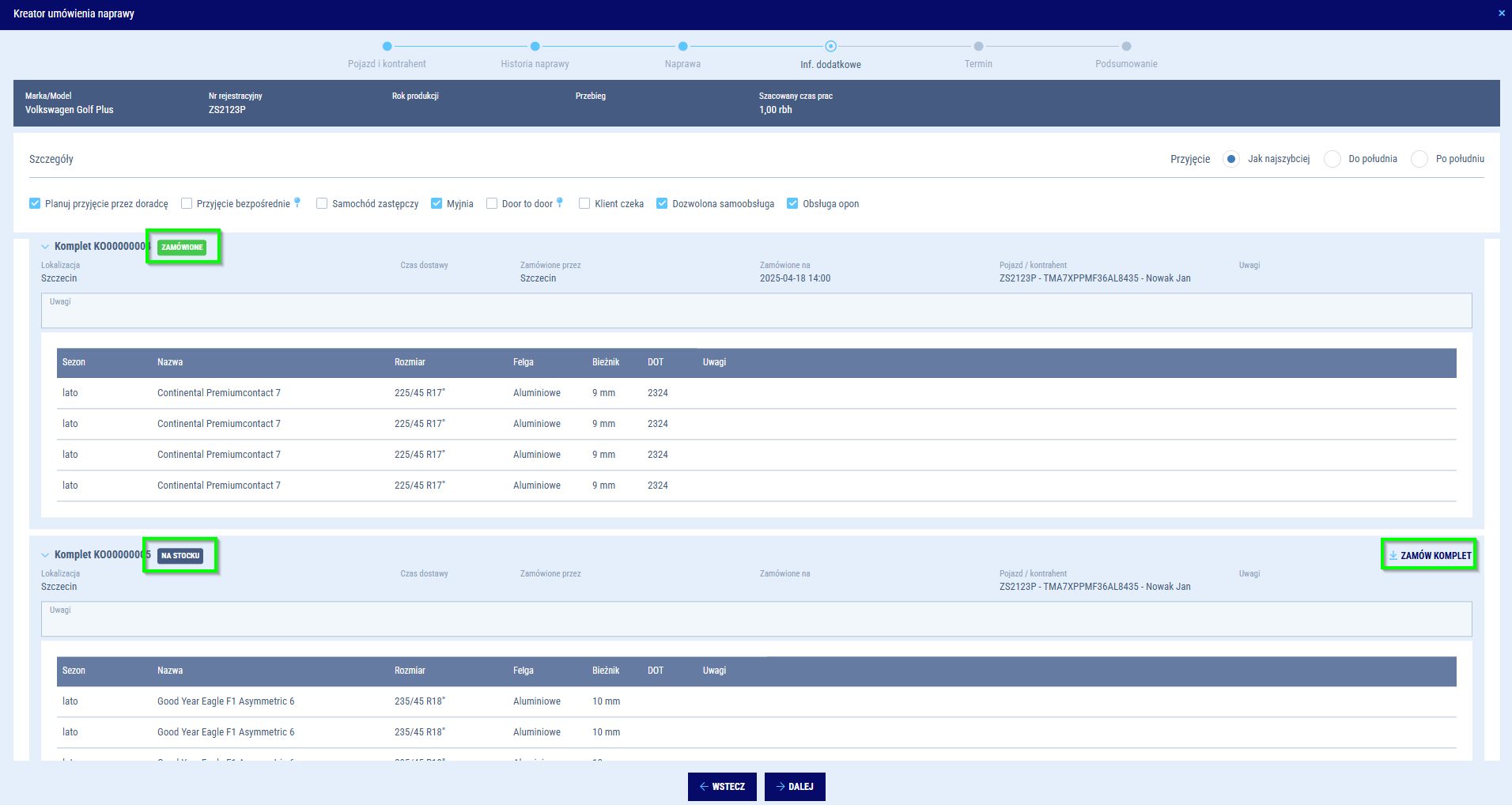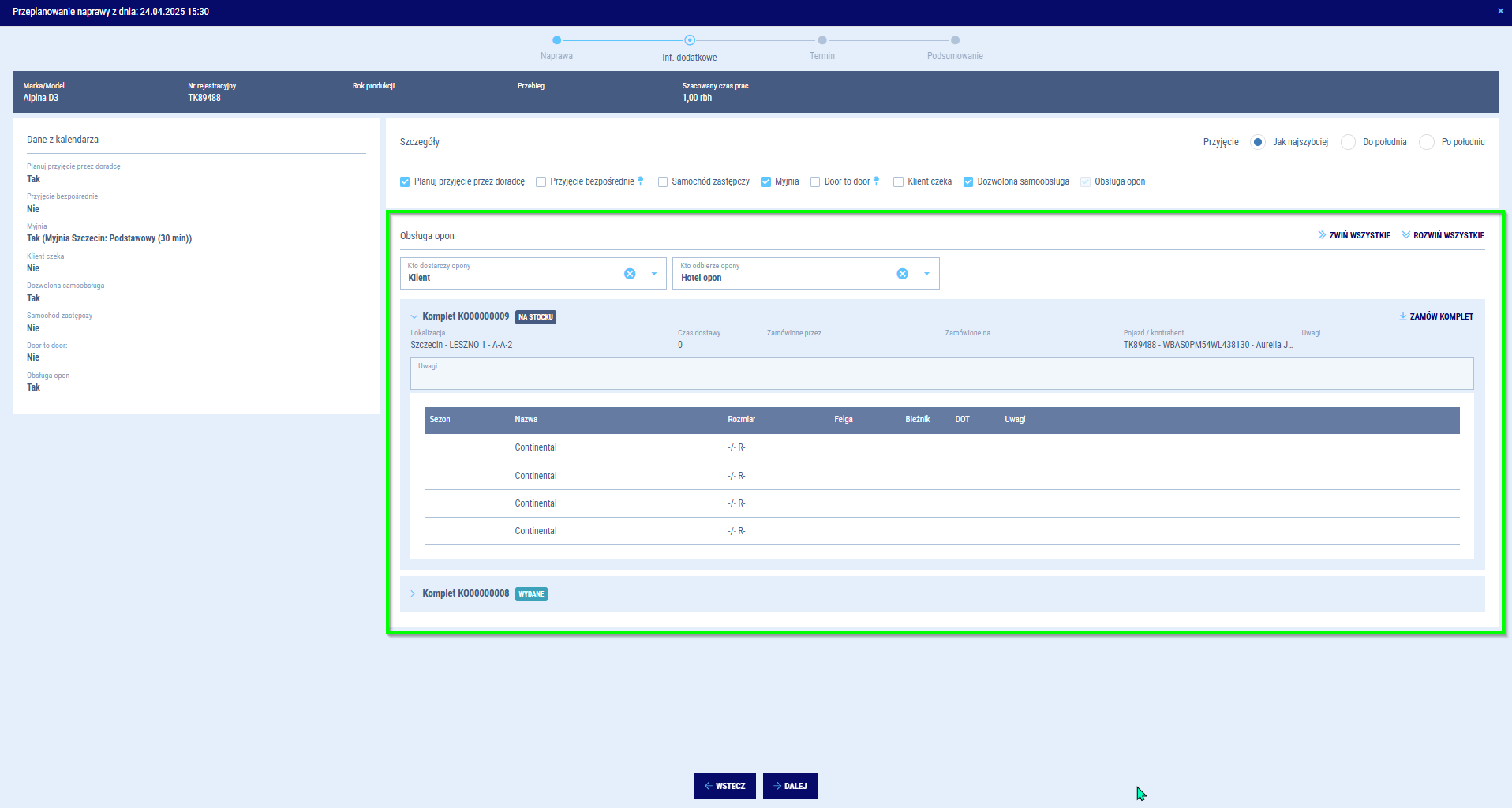 Wybrane komplety opon zostaną zamówione po zakończeniu planowania naprawy na dzień i godzinę zgodną z wybranym terminem naprawy.