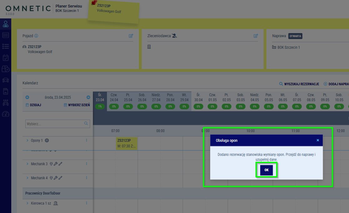 • Uzupełnij wymagane pola na formularzu nowej naprawy. Po dodaniu naprawy system rozpozna, że naprawa posiada rezerwację na stanowisku wymiany opon i pojawi okno z komunikatem który przekieruje Cię do edycji naprawy. W oknie edycji możesz dodać opcję 'Obsługa opon' i wybrać odpowiedni zestaw, oraz jeżeli nie ma zadania rezerwacji powiązanego z naprawą wybrać datę dostarczenia opon (Jeżeli przed zaznaczeniem opcji 'Obsługa opon' naprawa będzie miała jakąkolwiek rezerwację na mechanika, to data dostarczenia opon będzie uzupełniona datą rozpoczęcia prac mechanicznych).