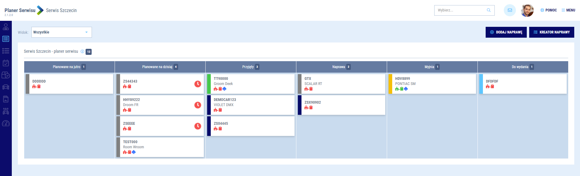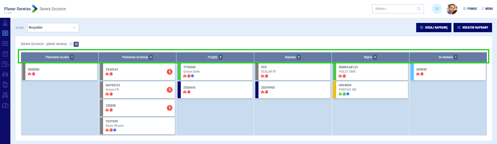 - Do wydania - naprawy, w których zaplanowano wydanie (teczka przesunie się do tej kolumny automatycznie po zakończeniu mycia lub po wydaniu pojazdu)