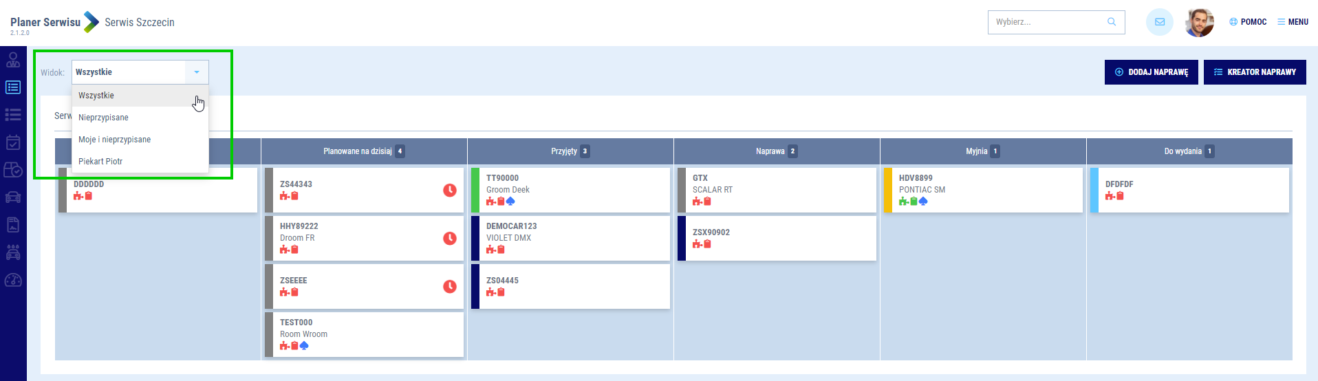 - Myjnia - naprawy, w których zaplanowano mycie (teczka przesunie się do tej kolumny automatycznie po rozpoczęciu mycia w Myjni)