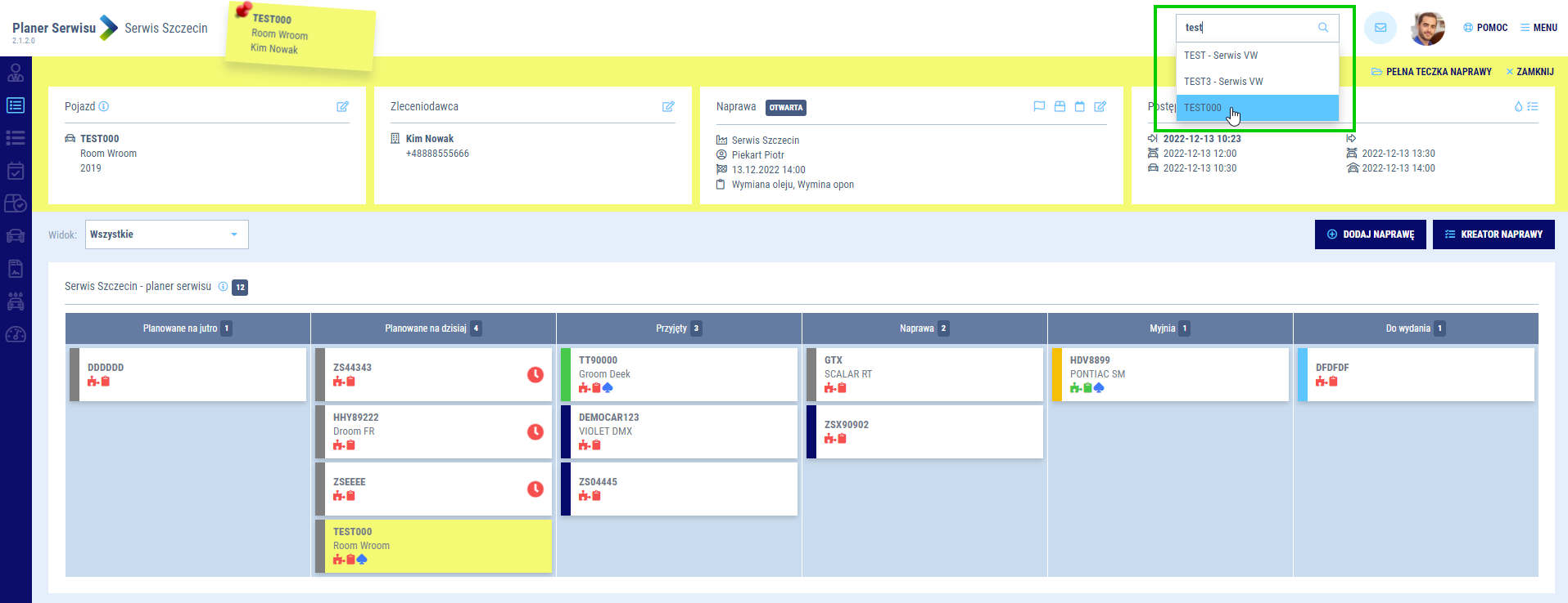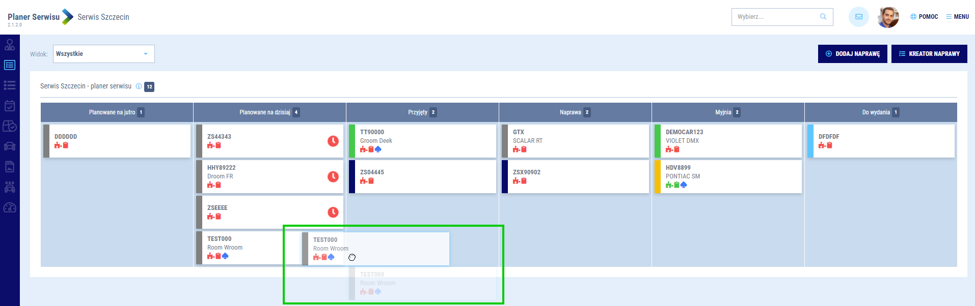 Teczki mogą być również przesuwane ręcznie pomiędzy kolumnami. Kolor teczki odzwierciedla bieżący status naprawy / zadania w danej kolumnie, zgodnie ze statusem danej rezerwacji.