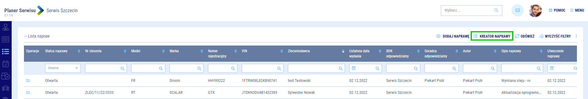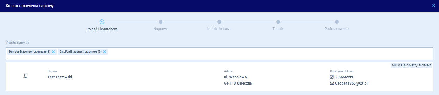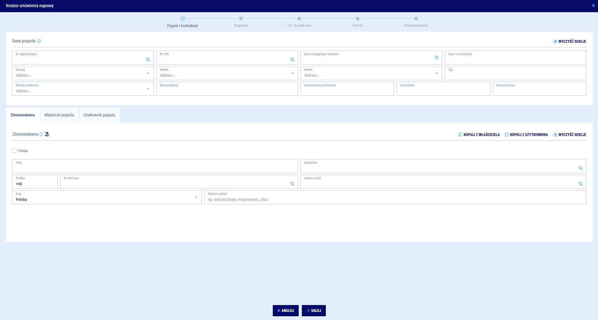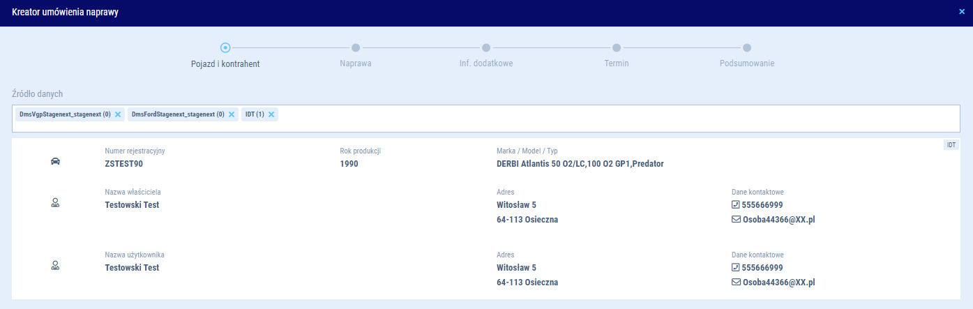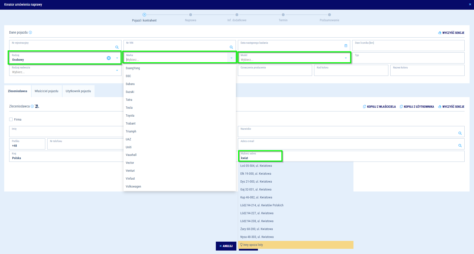 Kreator naprawy - Pojazd i Kontrahent