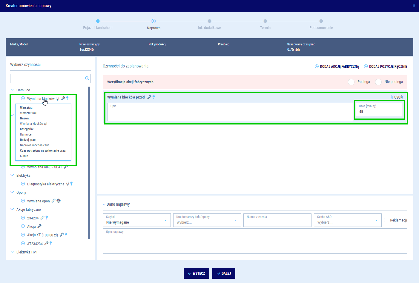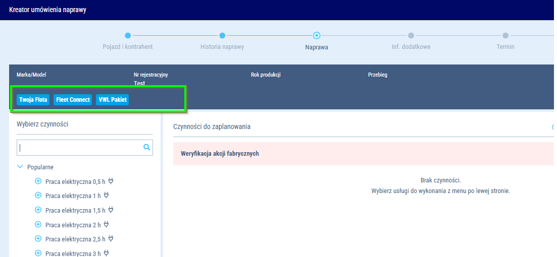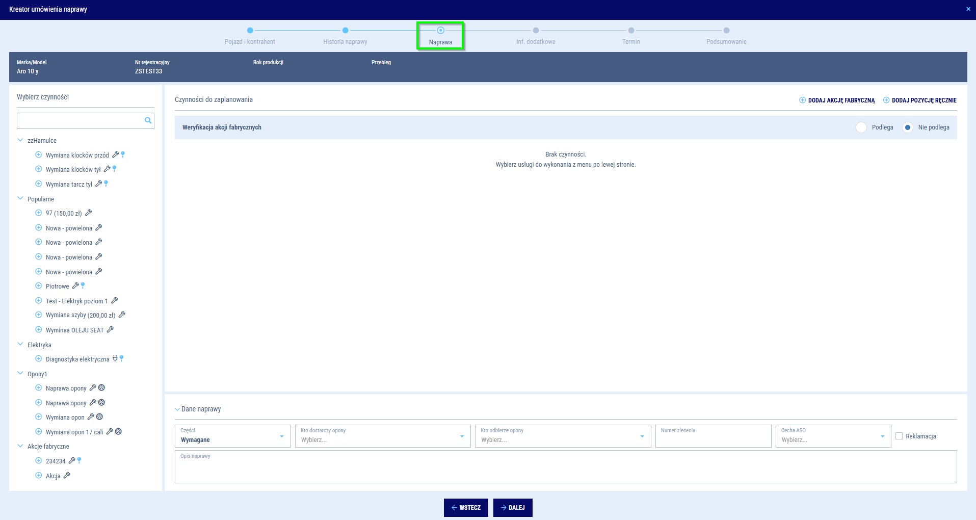 Kreator naprawy - weryfikacja akcje fabrycznych